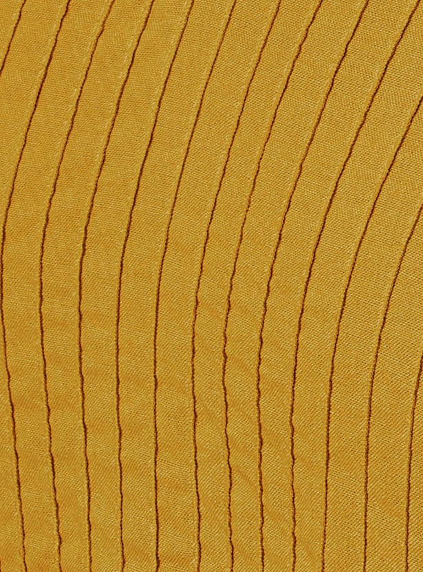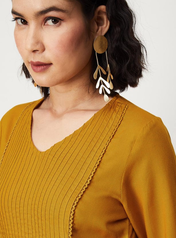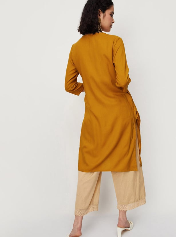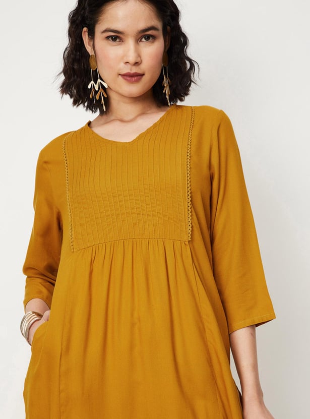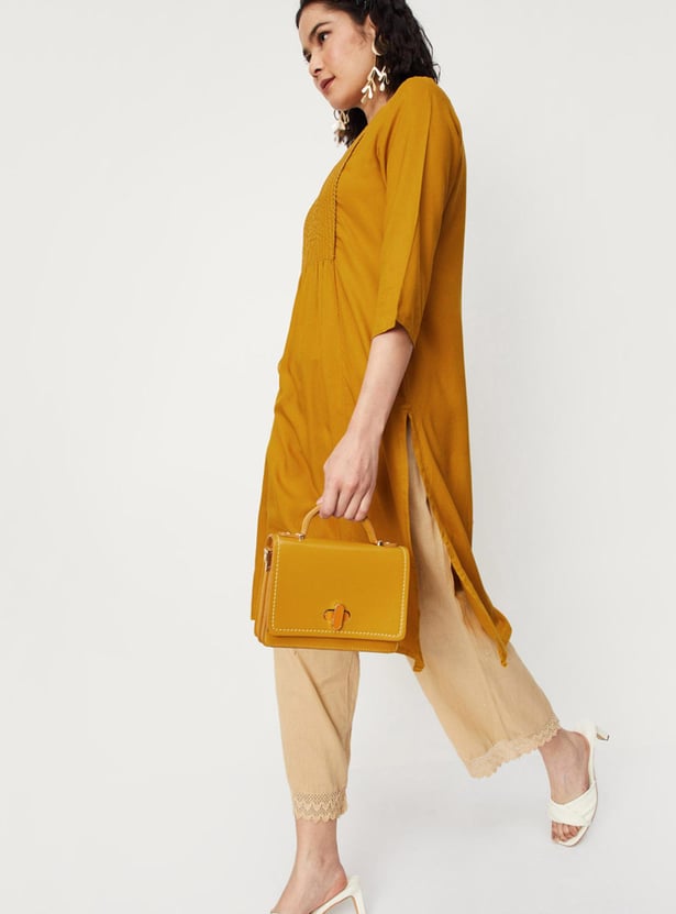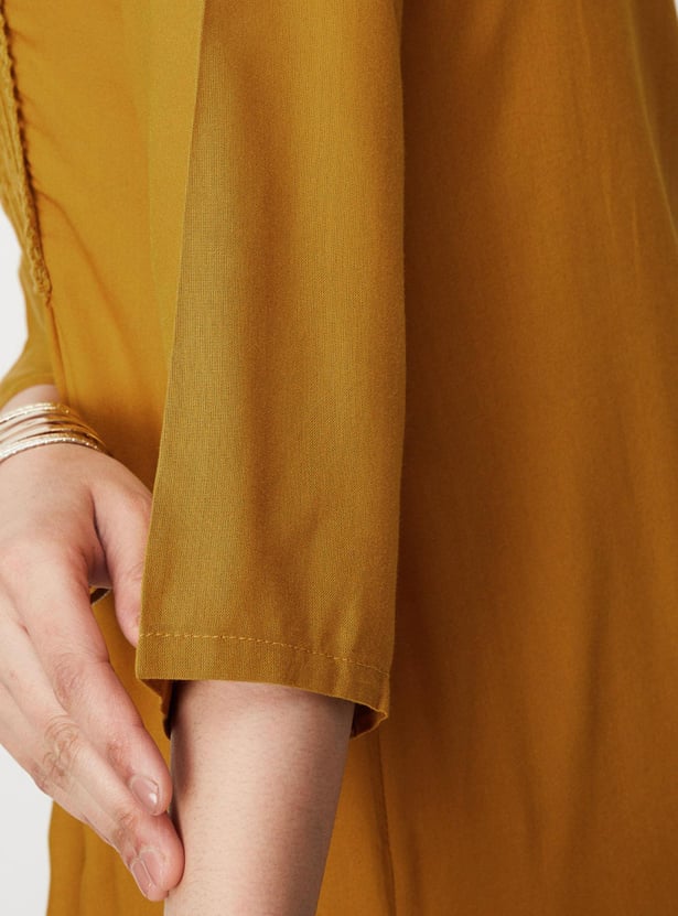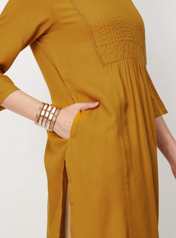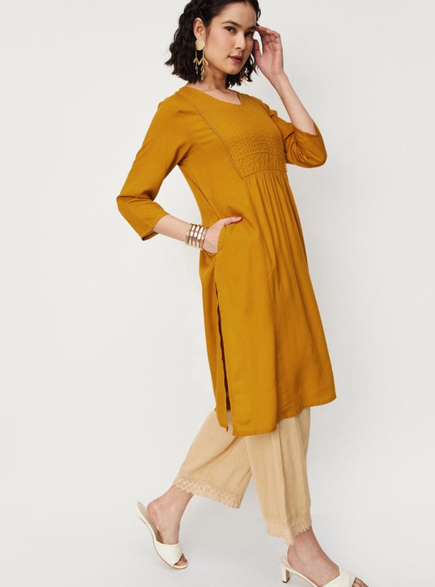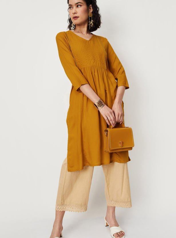 Create an effortless casual look with this straight kurta. It is designed with a V-neckline, pintuck yoke with crochet trim, gathered waist, three-quarter sleeves, and a side pocket. Pair this kurta with a pair of palazzos and block heels to nail the elegant style.