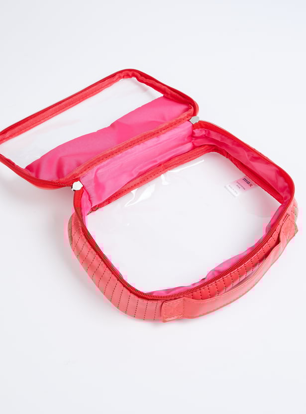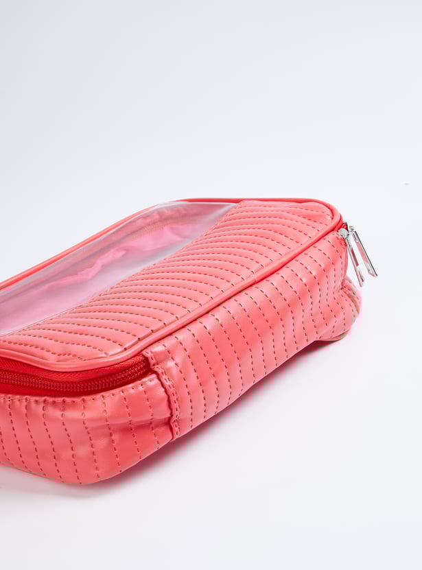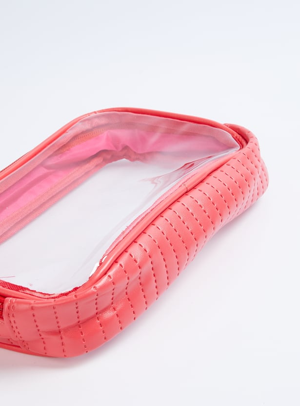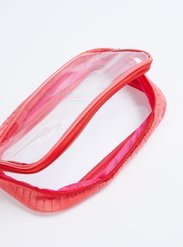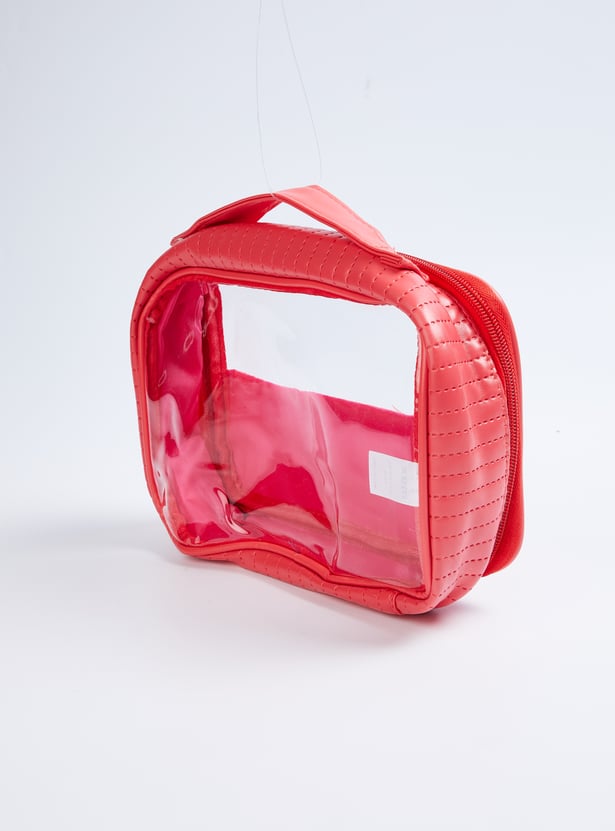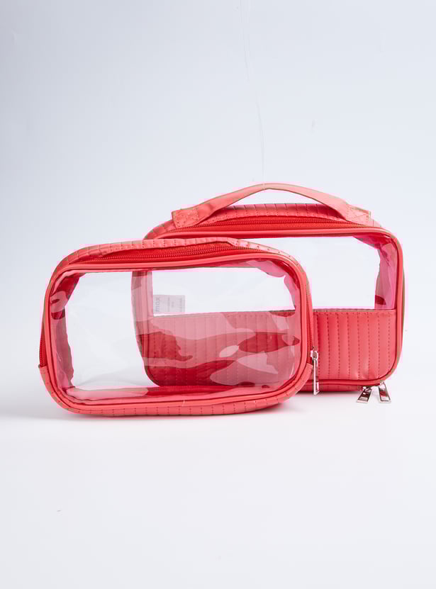 This pack of 3 pouches offers both style and practicality. Two feature a sleek metallic finish, while one is a see-through design, all with secure zip closures to keep your essentials organized.