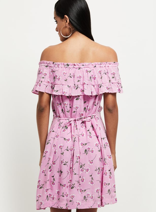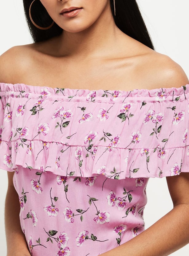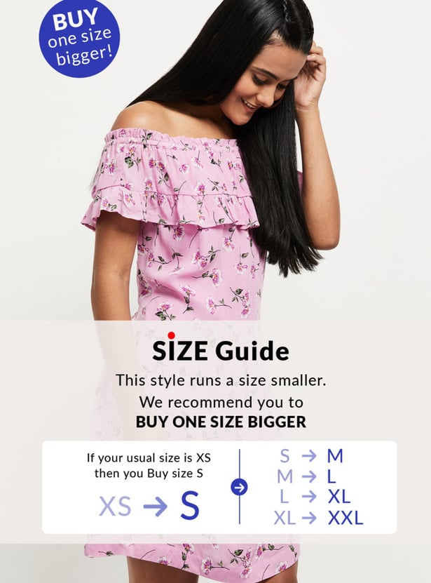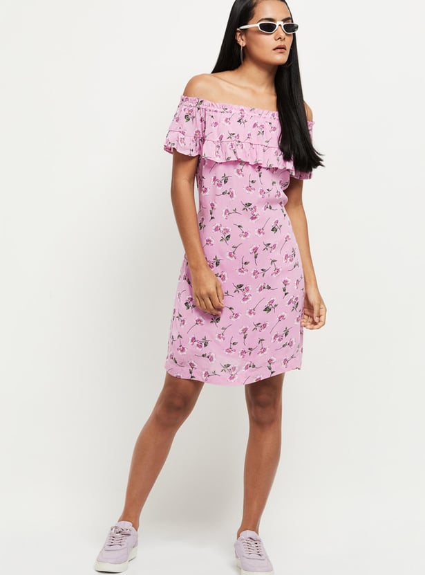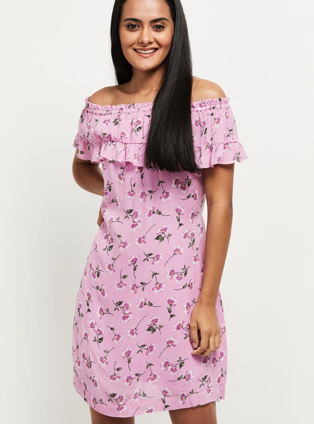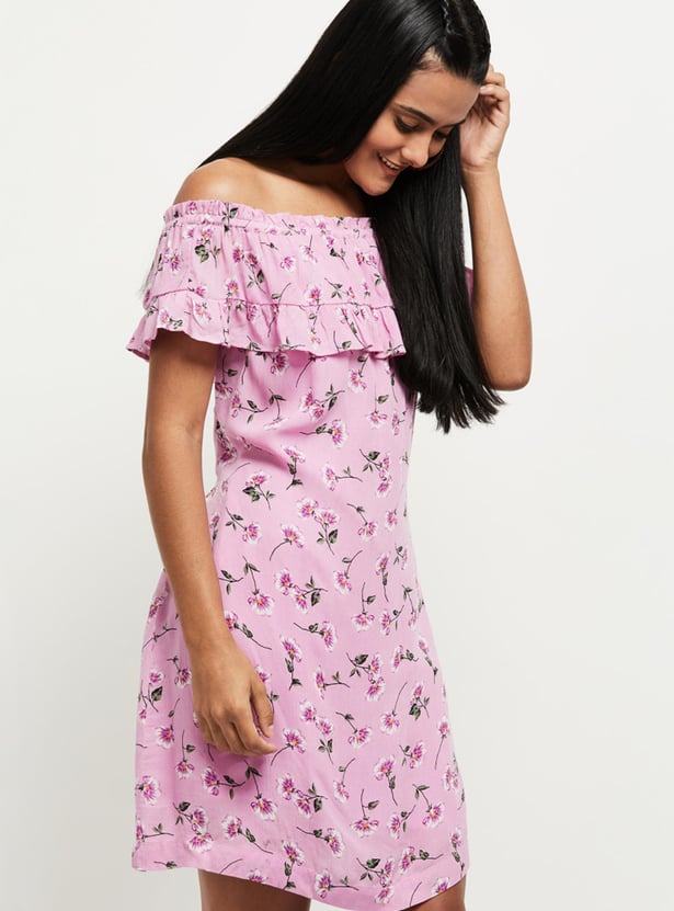 A printed Bardot dress that has short sleeves and off-shoulder neck is the right option for a casual weekend.