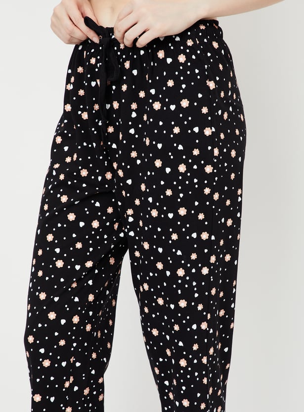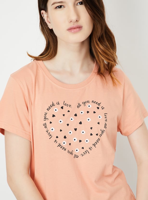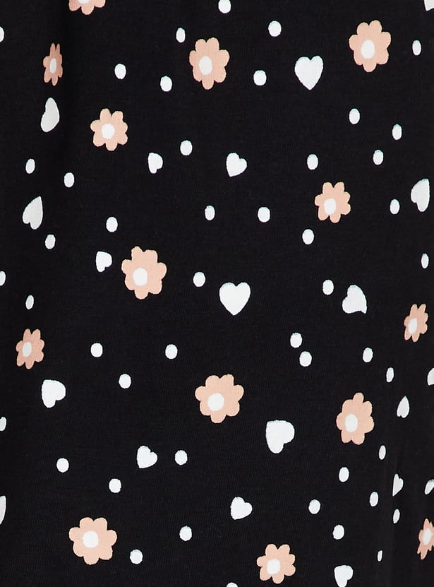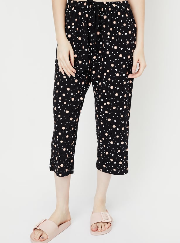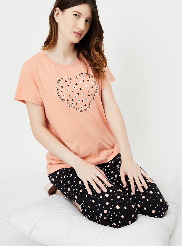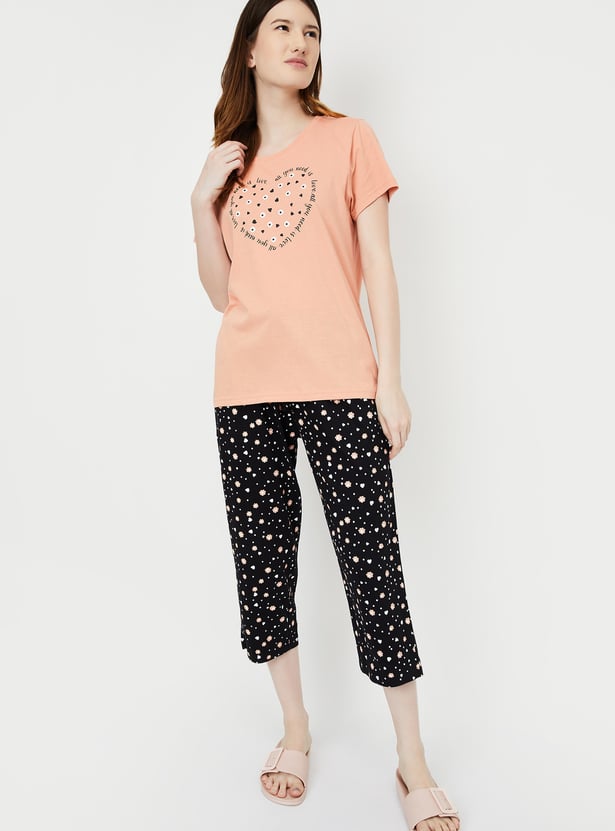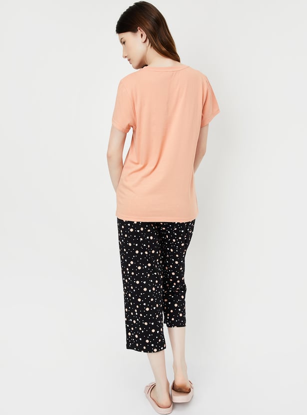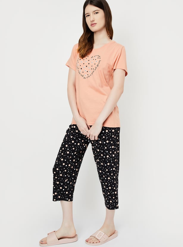 Dive into dreamland with this set. It includes a tee with a round neck, half sleeves, and a graphic print at the front. The pair of capris features all-over prints, a drawstring waist, and a cropped profile, making it a stylish and comfortable choice for bedtime.