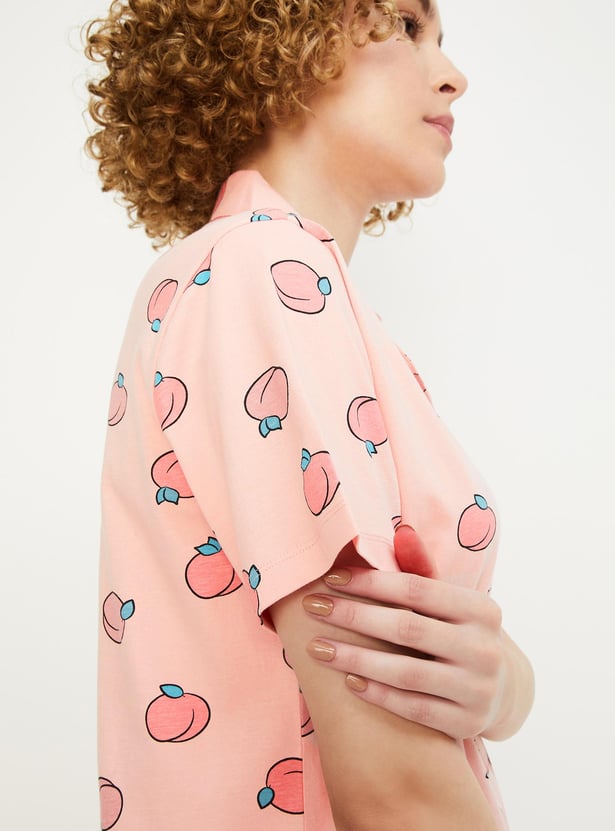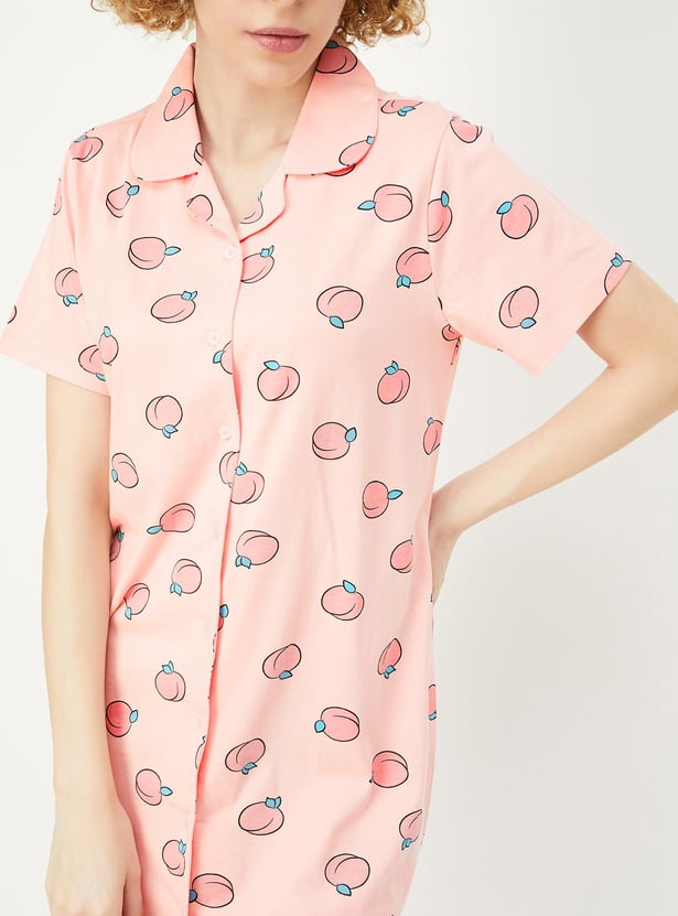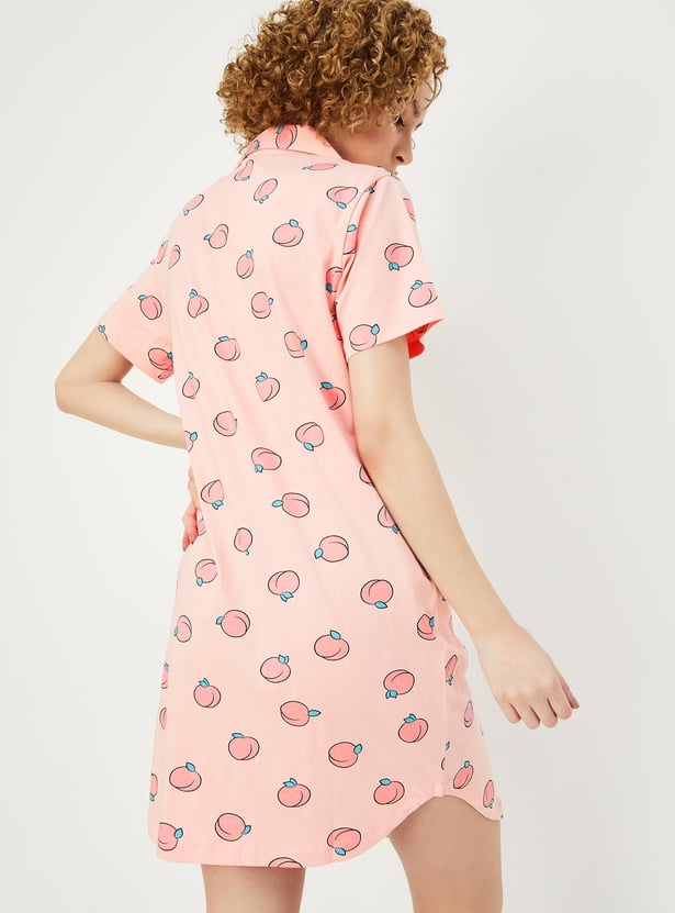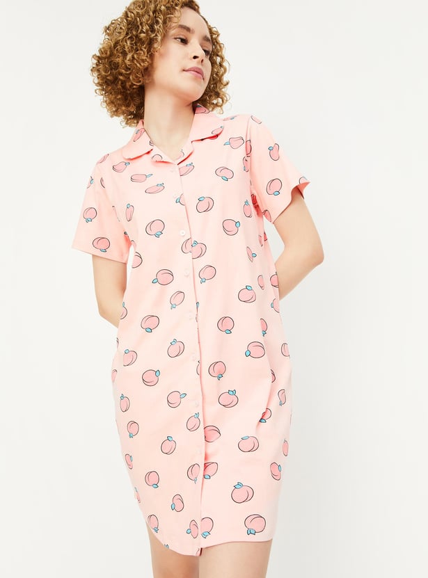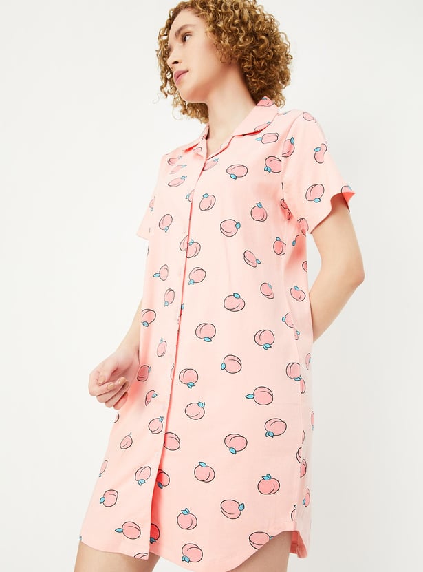 Relax and chill at your home with this printed chemise featuring a resort collar with button placket, short sleeves, and a curved hem.