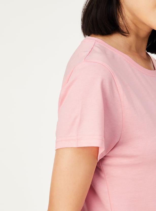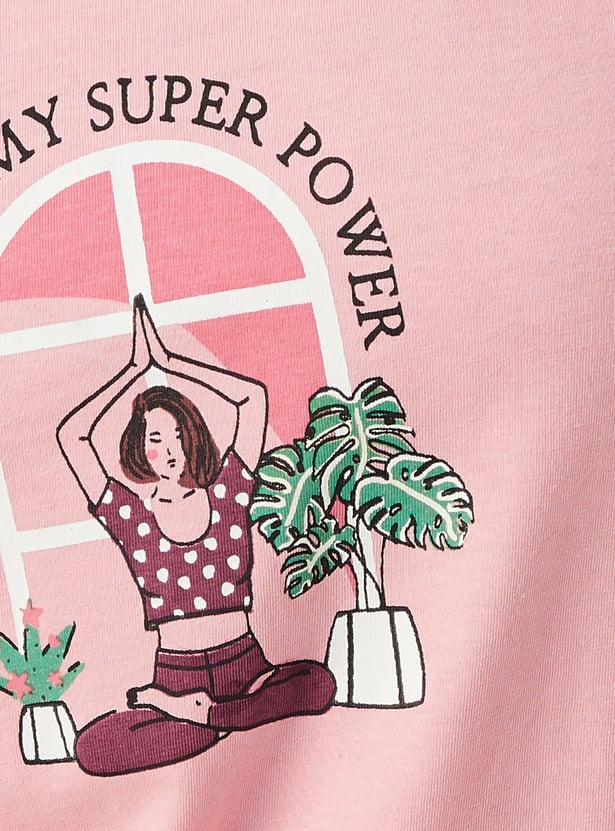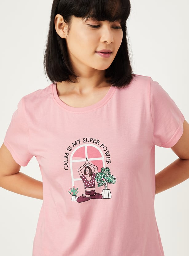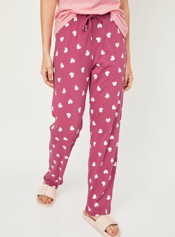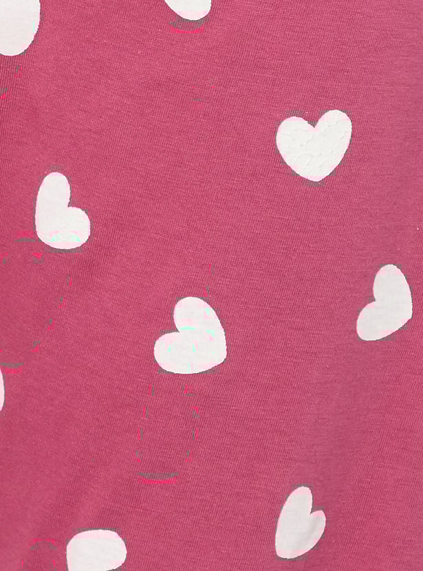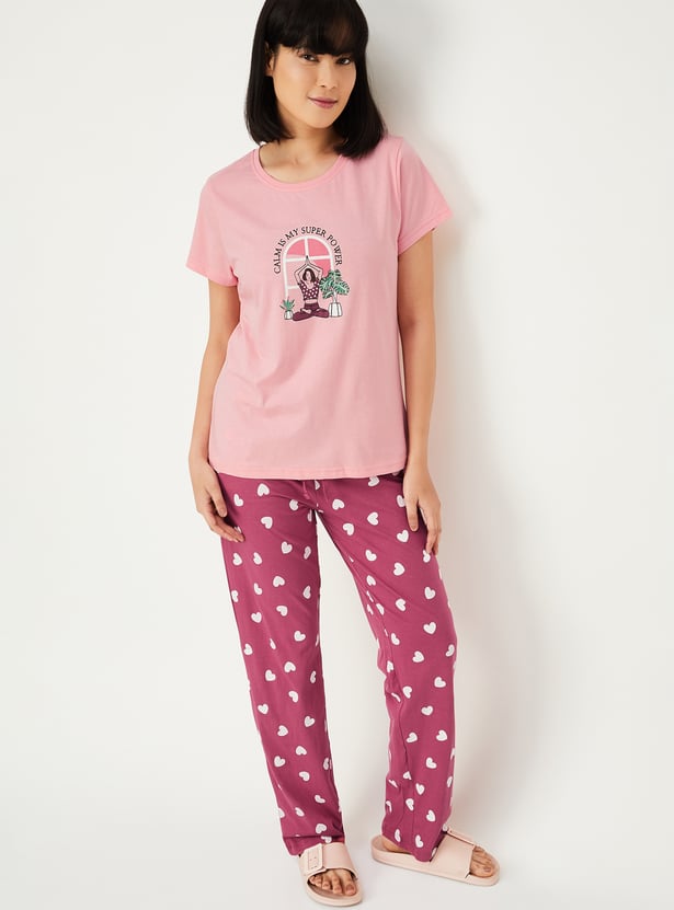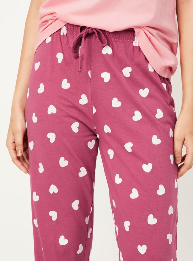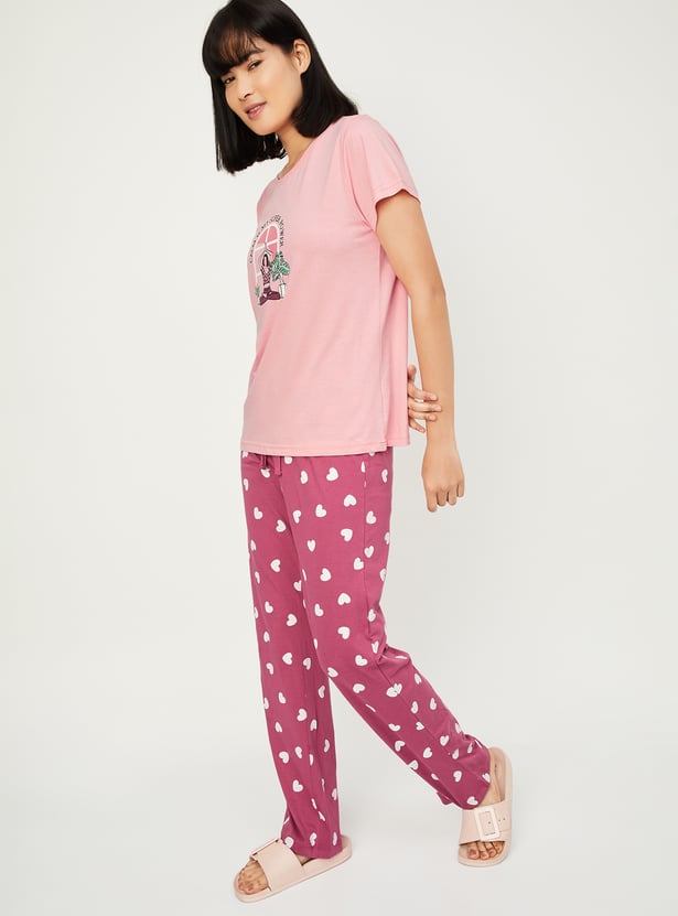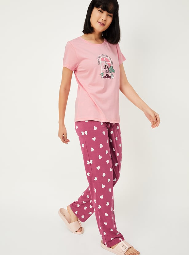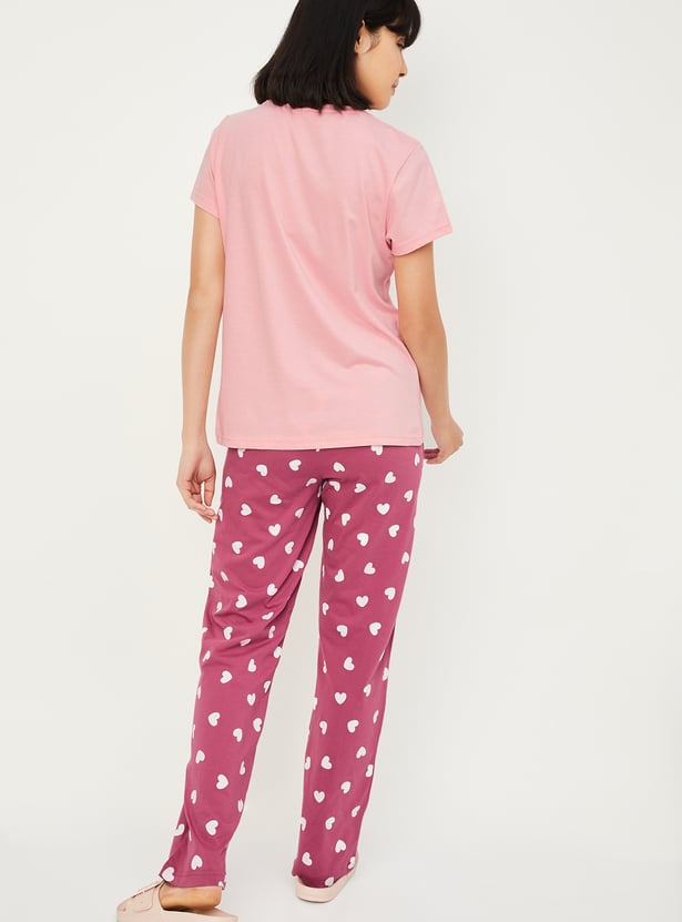 Relax in style with this printed sleepwear set. It features a graphic printed T-shirt with a round neck, and half sleeves, paired with matching pyjamas that have an all-over heart print, elasticated waist, and drawstring for a comfortable fit.