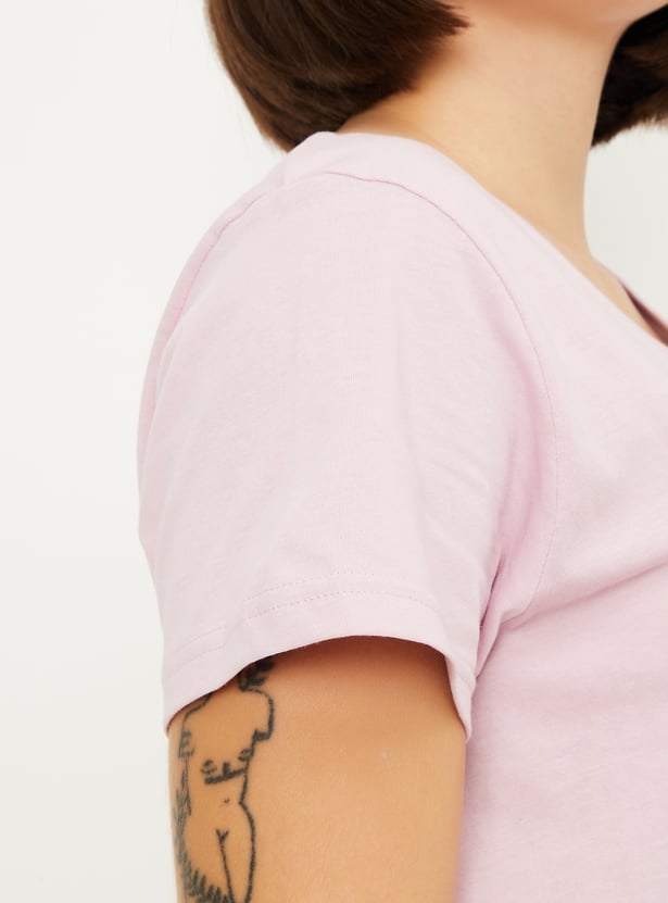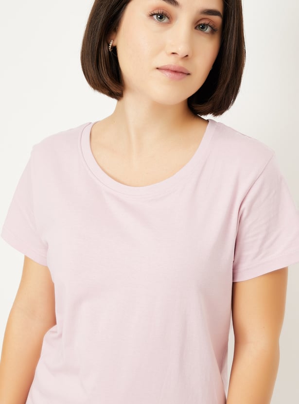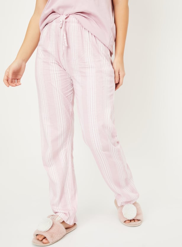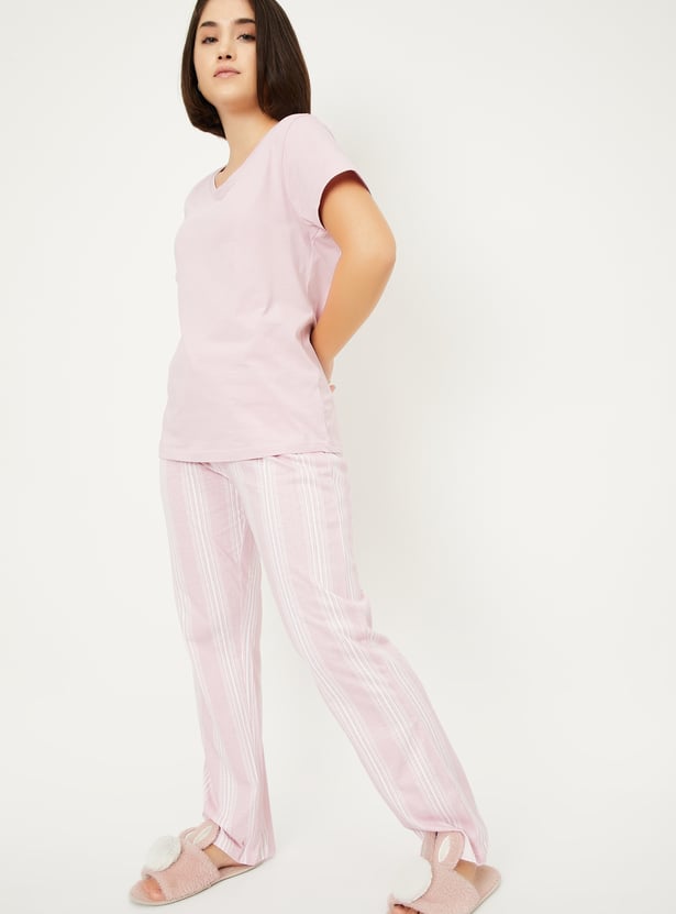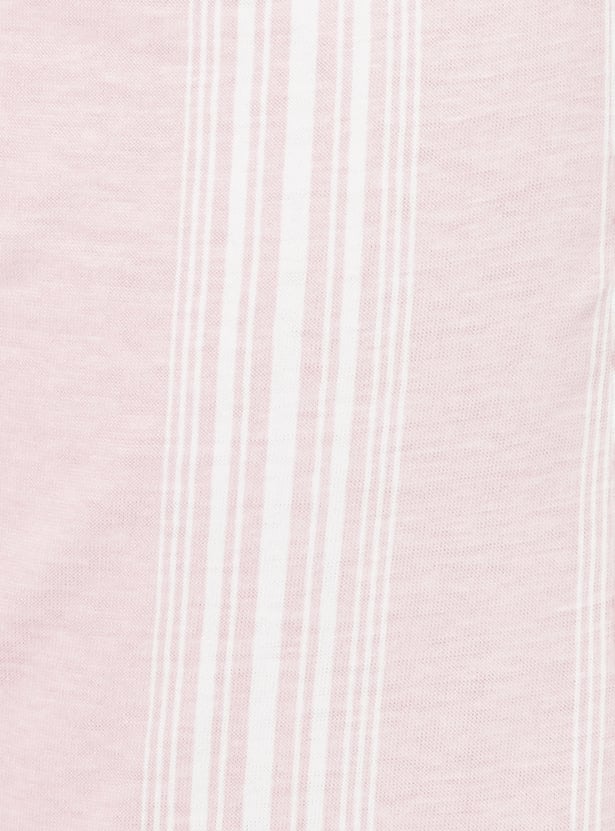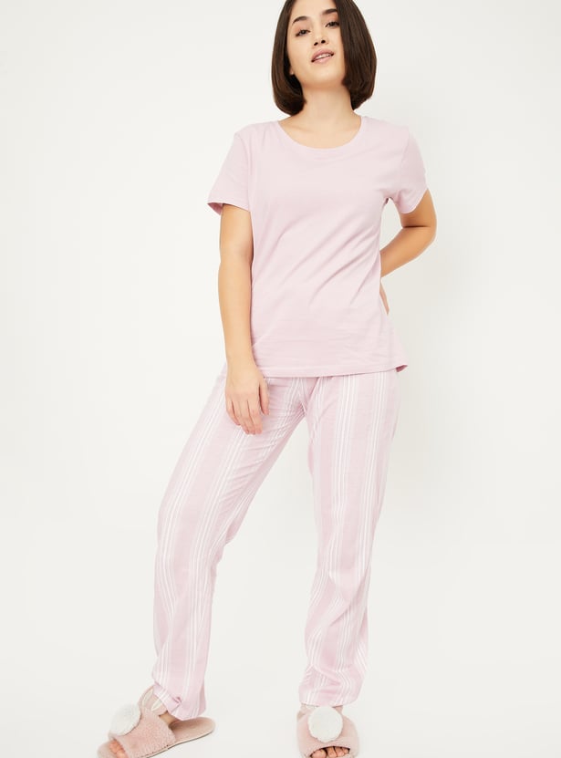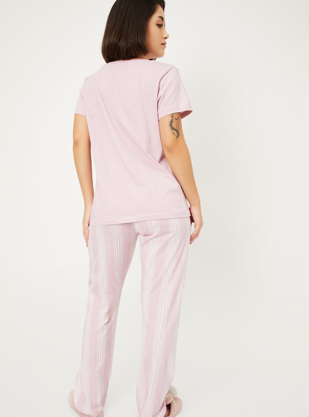 Stay cozy and stylish with this printed PJ set featuring a round-neck, half-sleeve T-shirt and complementing striped pyjamas with drawstring waist for a relaxed vibe.