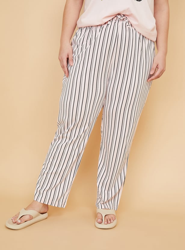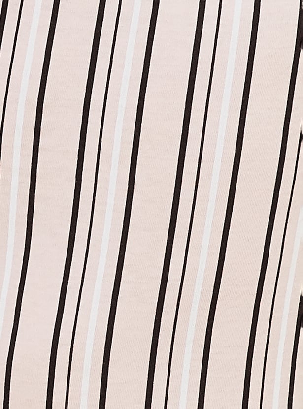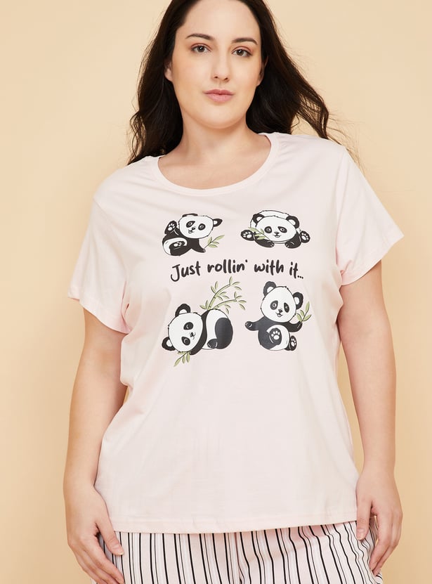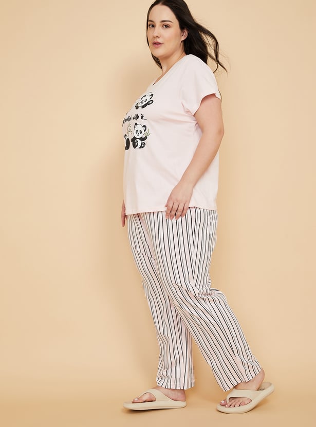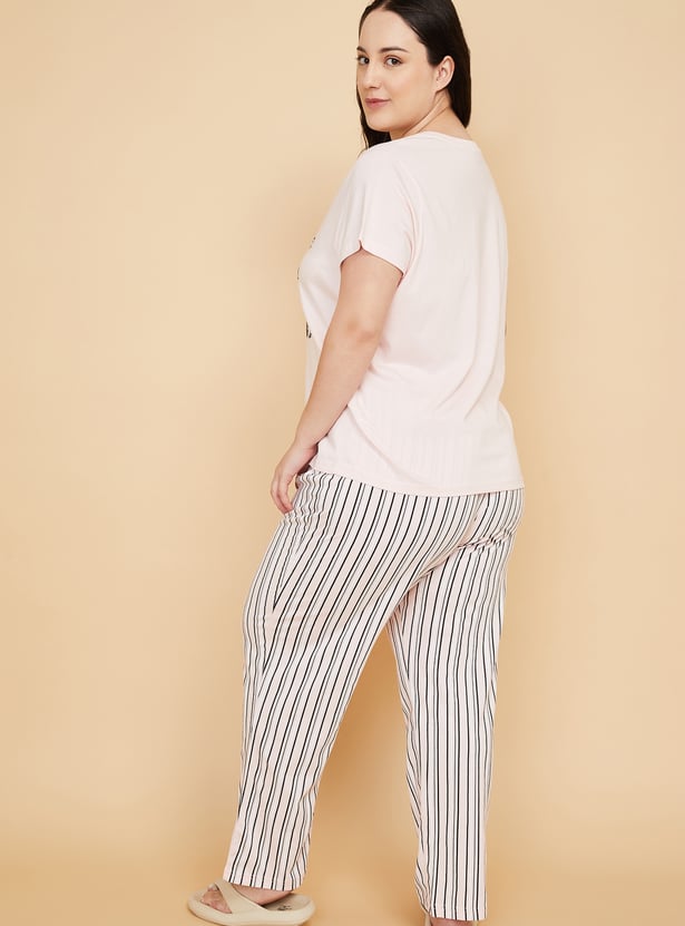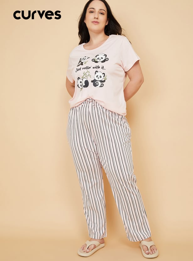 This printed PJ set features a round neck T-shirt with half sleeves, adding a cheerful touch to everyday lounging. The striped bottoms come with an elasticated waist, offering easy comfort and a relaxed fit for unwinding. Model Size :