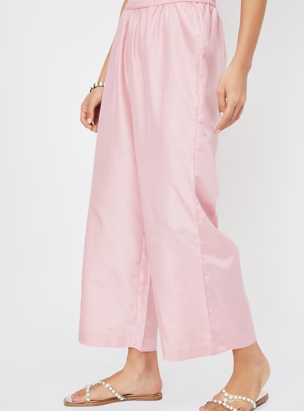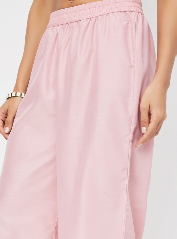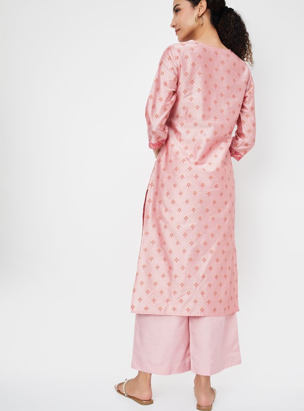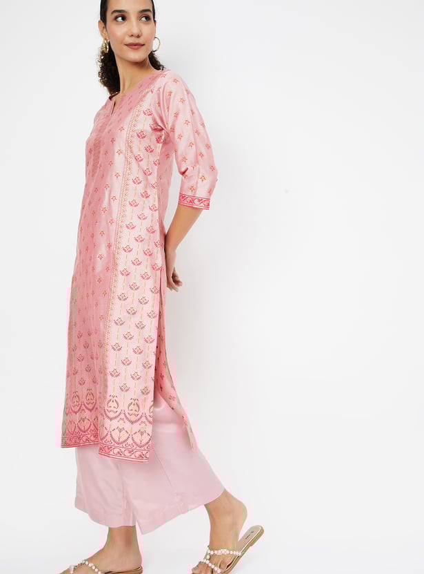 Embrace elegance with this kurta set. The beautifully printed straight-cut kurta features a notched neck, adding a touch of sophistication to its classic design. A convenient waist pocket enhances both style and functionality. Paired with palazzos that have an elasticated waist, this set ensures comfort and a flattering fit, making it a standout choice for any occasion.