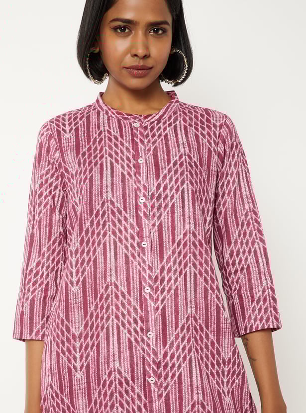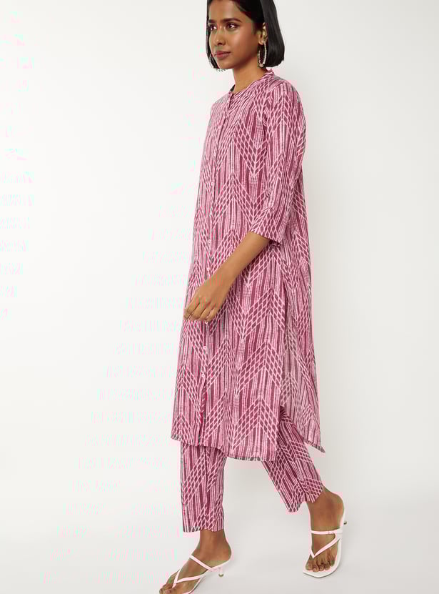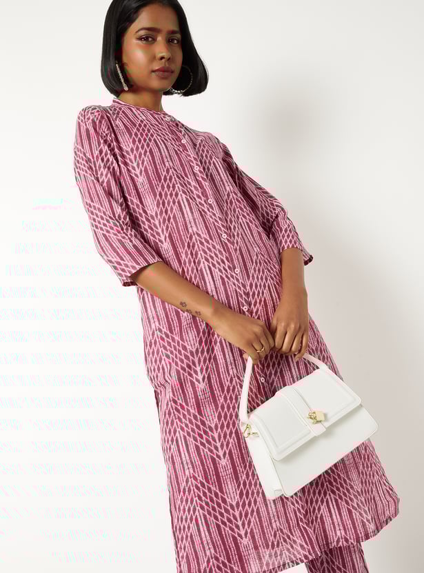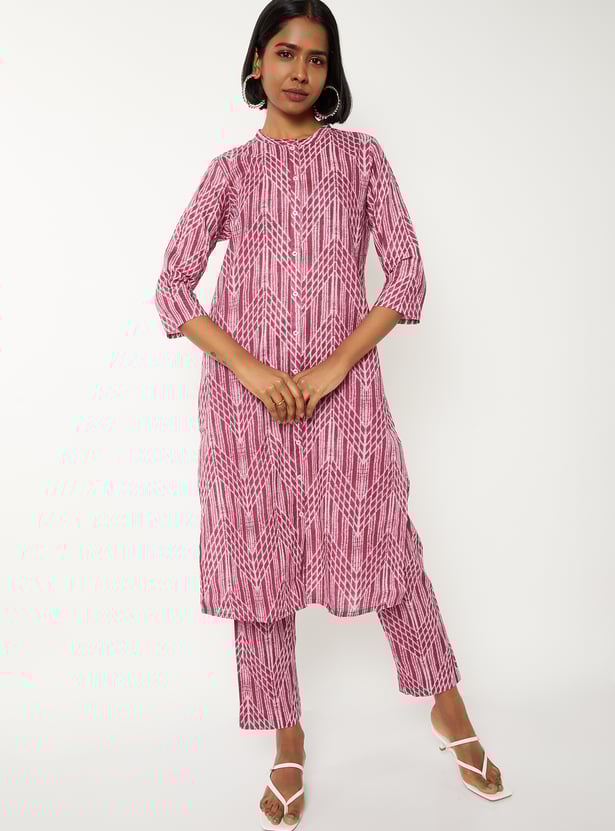 Elevate your ethnic style with this printed straight kurta set. The kurta features a refined band collar and 3/4th sleeves for a polished look. Paired with straight pants that have an elasticated waist, it offers both comfort and functionality.
