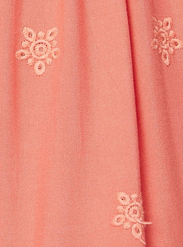 Breeze through the day in style in this pair of palazzos with embroidery all over and schiffli detailing on the hem. It features an elasticated waist and wide legs. Style this pair of palazzos with a crop top and block heels to step up your fashion game.