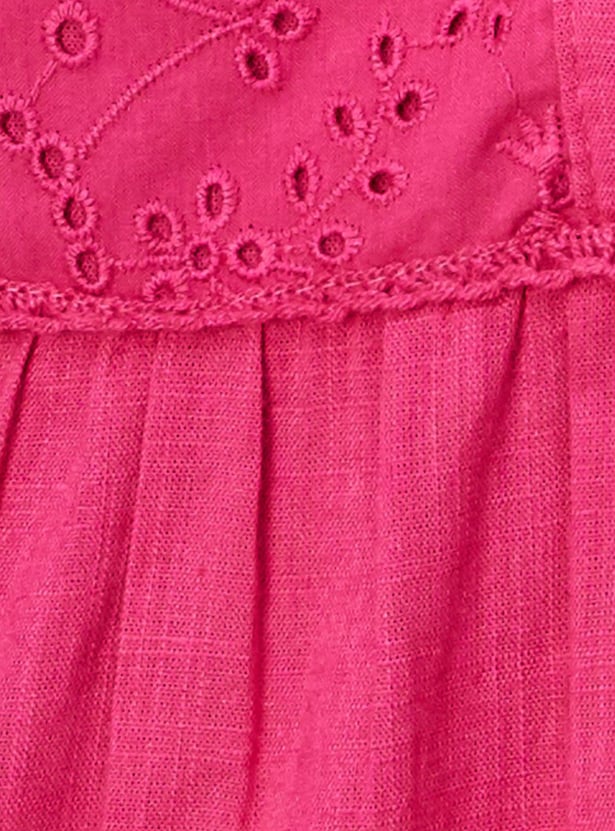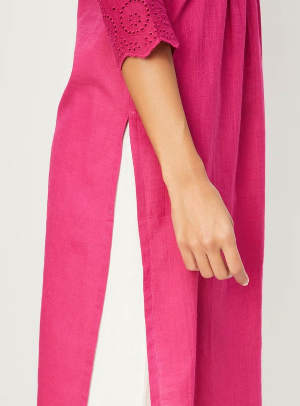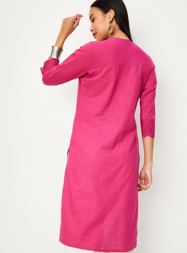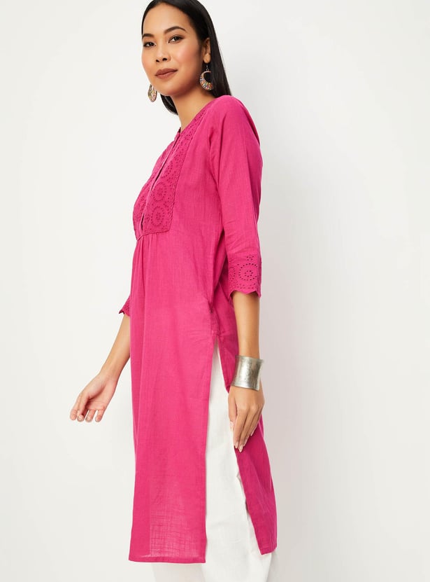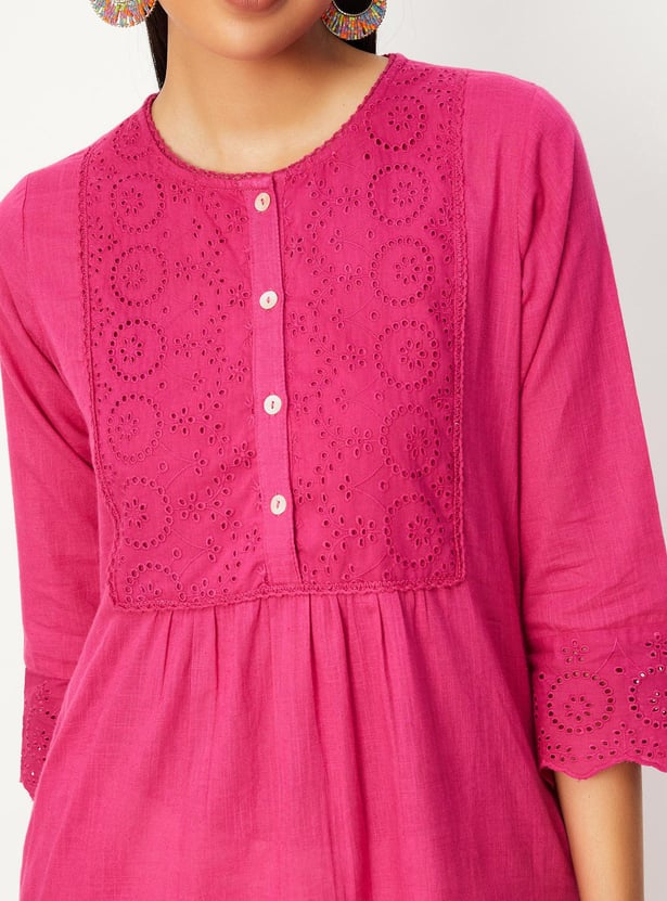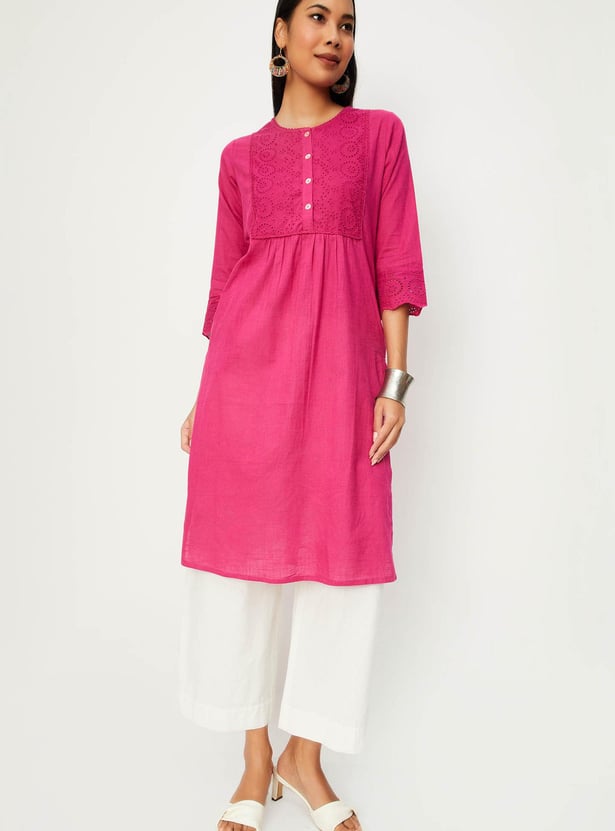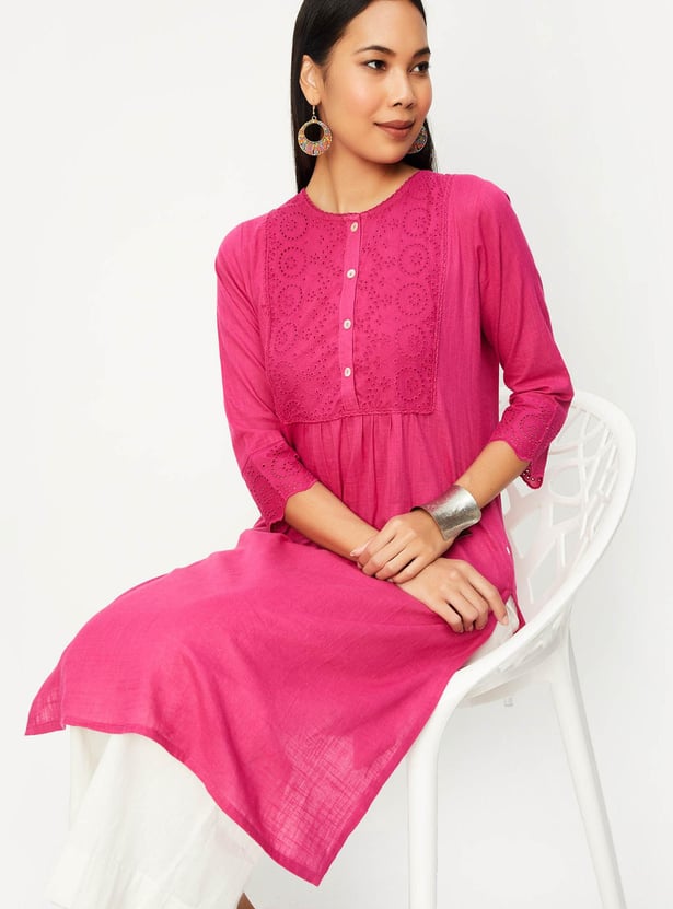 Flaunt your look with this straight kurta is designed with a schiffli detailed yoke, a round neck with buttons, three-quarter sleeves, and knee-length construction. Team this kurta with a pair of palazzos and flats to make your outfit look complete and elegant.
