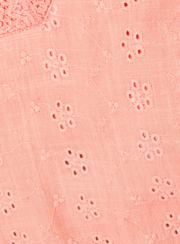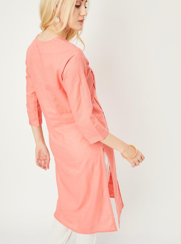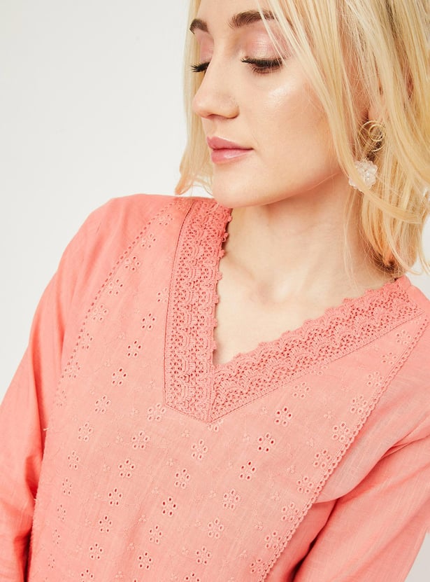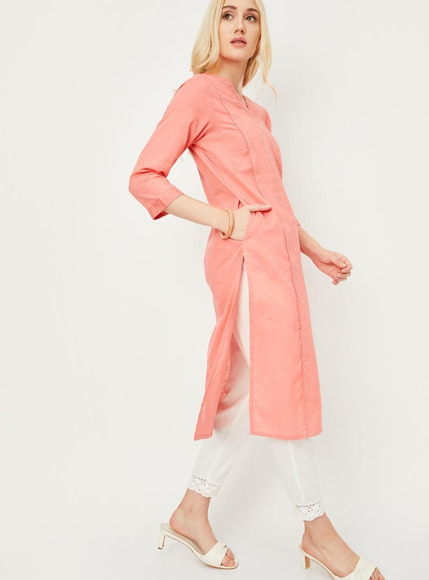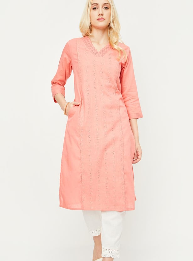 Elevate your style with this straight kurta featuring a schiffli design. With a V-neck adorned with lace, three-quarter sleeves, pockets, and knee-length construction, it's perfect for adding a touch of glamour to any occasion.