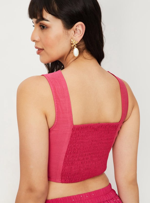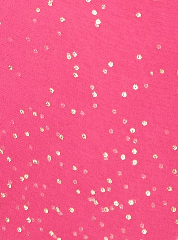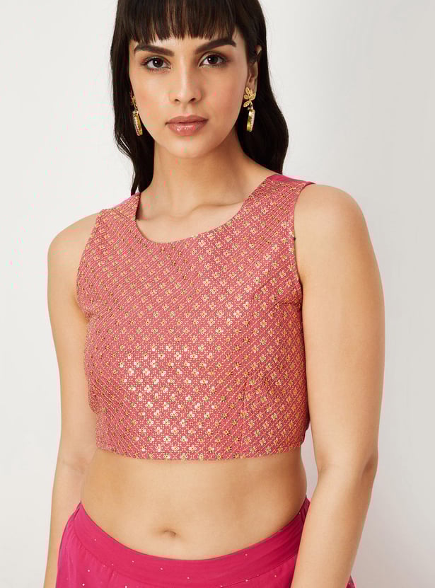Dress up for occasions and celebrations in this pre-stitched saree. It has a partially elasticated waist, a long skirt, a pleated front, and an attached pallu with embellished accents. The blouse has a round neckline, sleeveless construction, sequin detailing, and a smocked back. Pair this saree set with flat sandals and a clutch to gear up for a memorable evening.