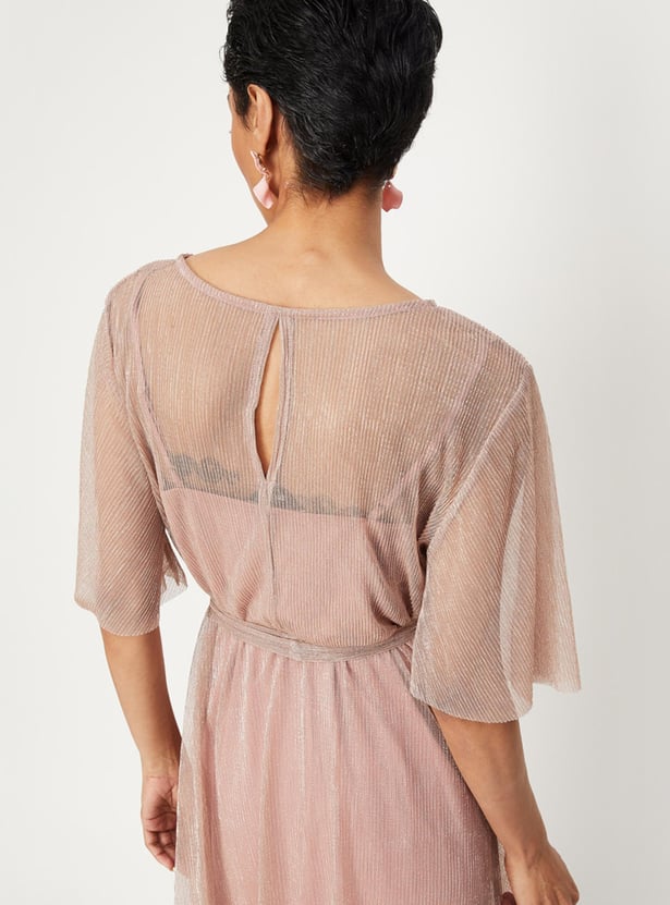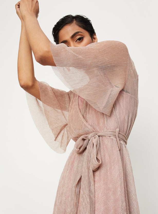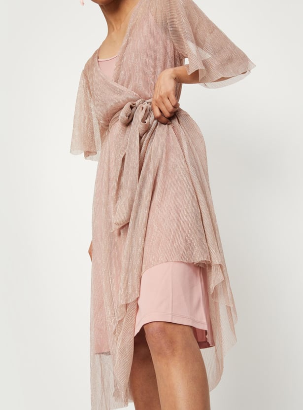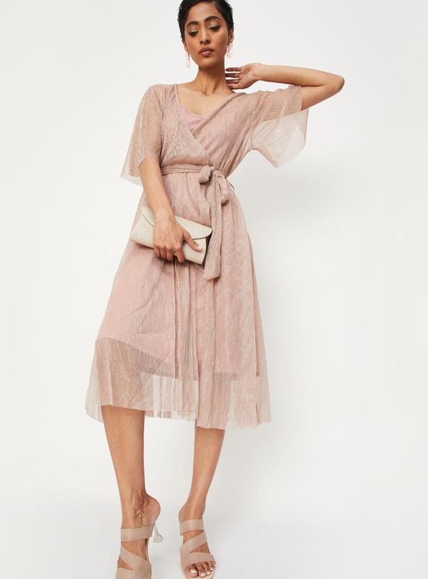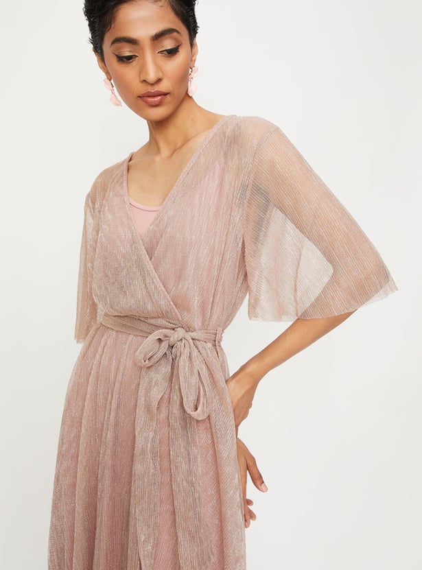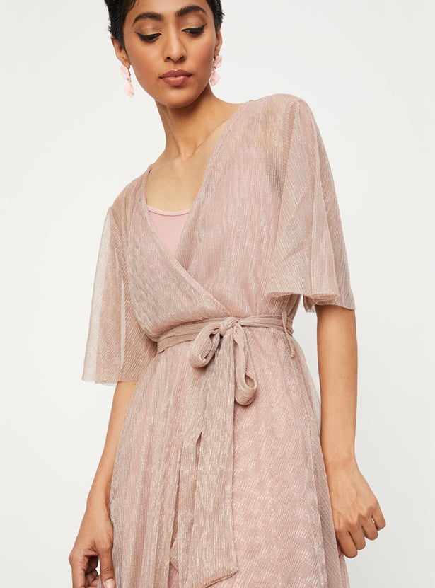 Shimmer and shine all through the night with this wrap dress. It features a surplice neckline, flutter sleeves, a tie-up at the waist, and a solid lining. Make a statement by styling this dress with heels.
