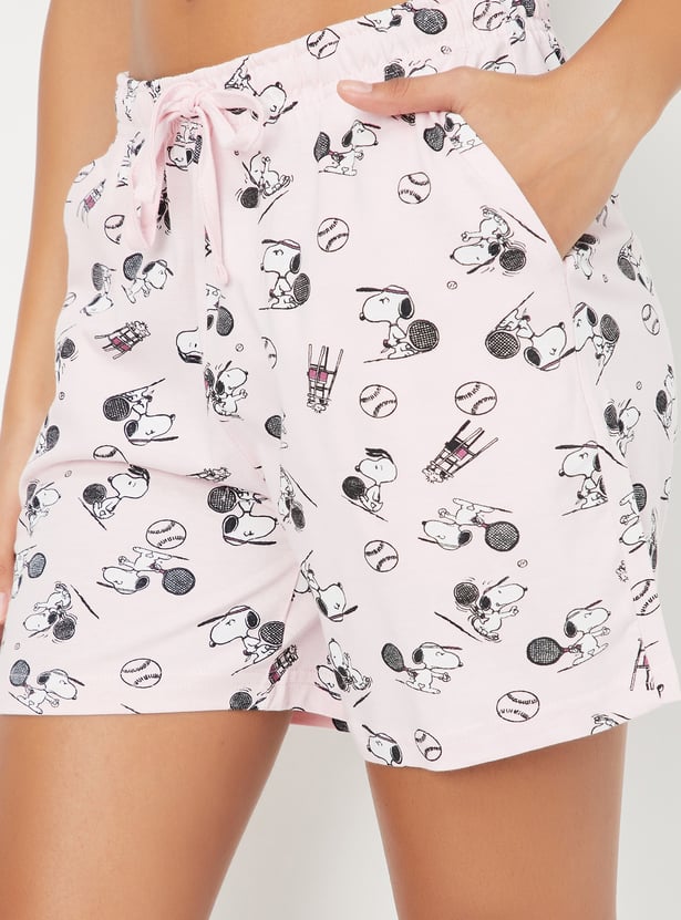 These Snoopy print shorts add a playful touch to your casual wardrobe. Featuring a drawstring closure and insert pockets, they offer both comfort and functionality.