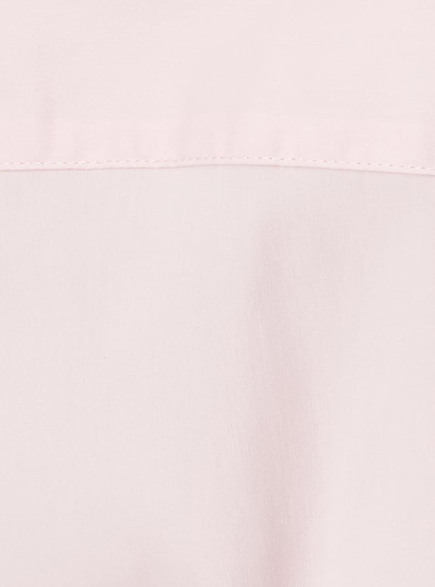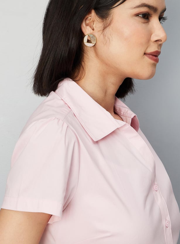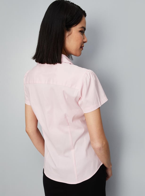 Exude an air of sophistication with this formal shirt. It is rendered in a solid tone with a spread collar, short sleeves, and a curved hem. Team up this shirt with a pencil skirt and pumps to ace the look.