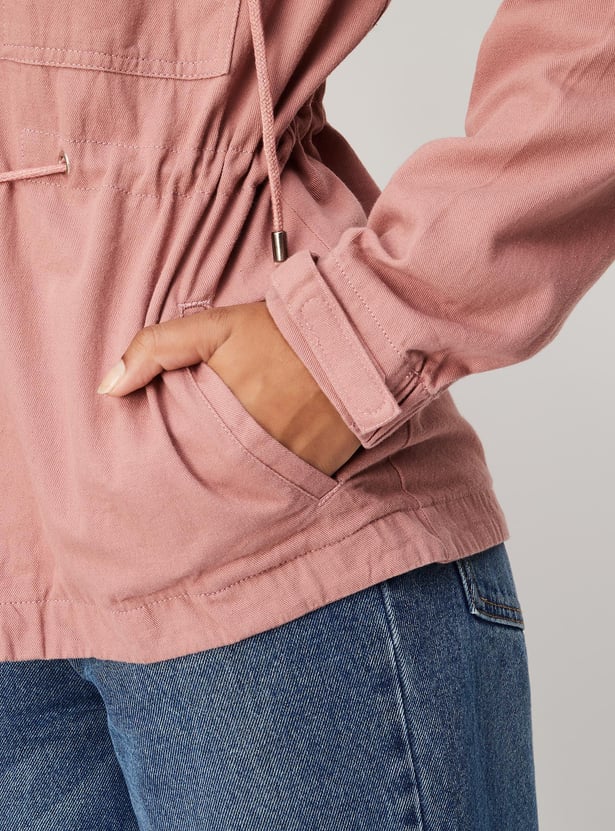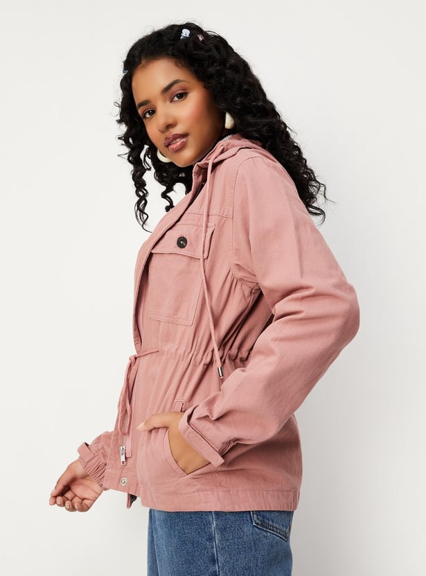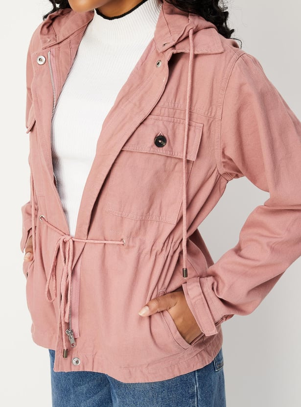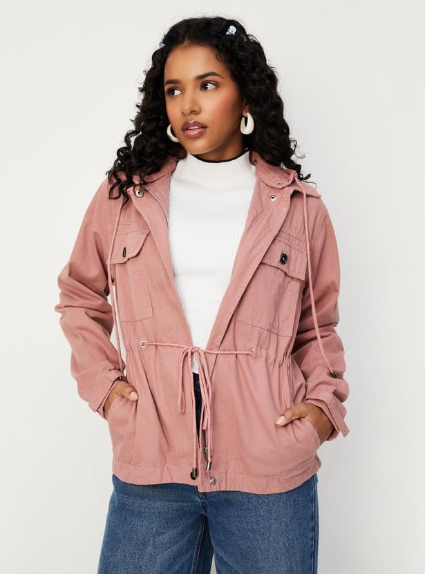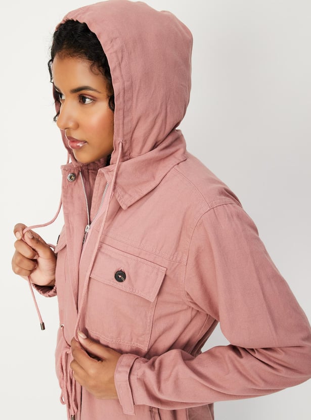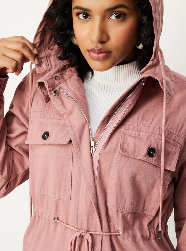 Beat the winter blues in style in this jacket. It features a solid tone design, a long profile and a drawcord waist. This jacket is fashioned with a detachable hood, full sleeves with tabs at the cuffs, and a zip front. This longline jacket has double buttoned flap pockets and waist pockets add to the functionality.