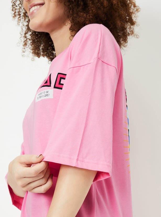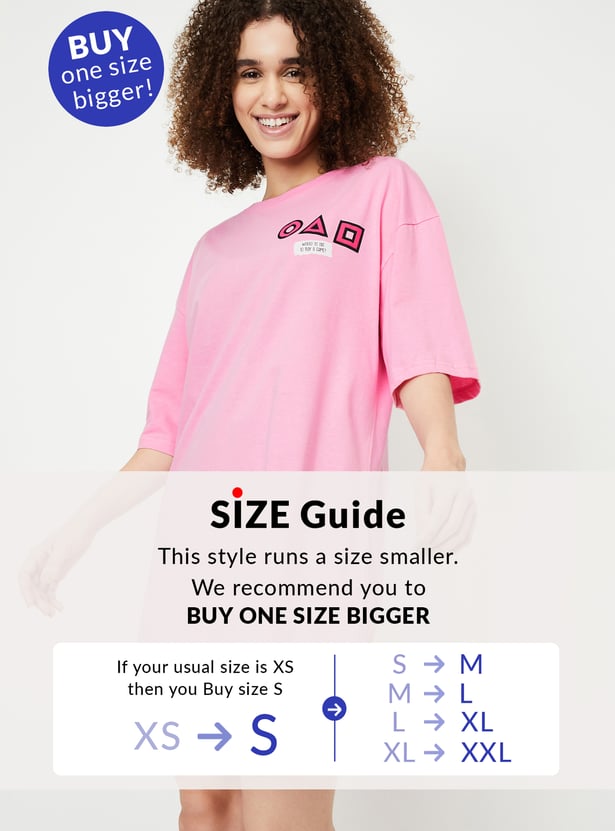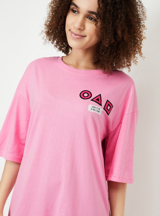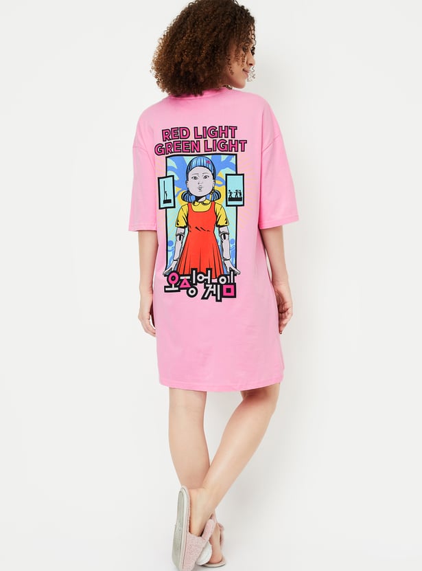 Embrace cosy vibes with this Squid Game chemise, featuring a boxy fit, round neck, and half sleeves. Highlighted by a bold Squid Game print at the back, it effortlessly combines comfort and playful charm, making it a standout choice for loungewear.