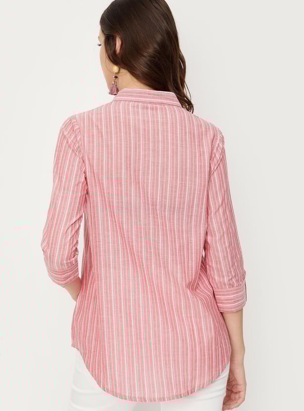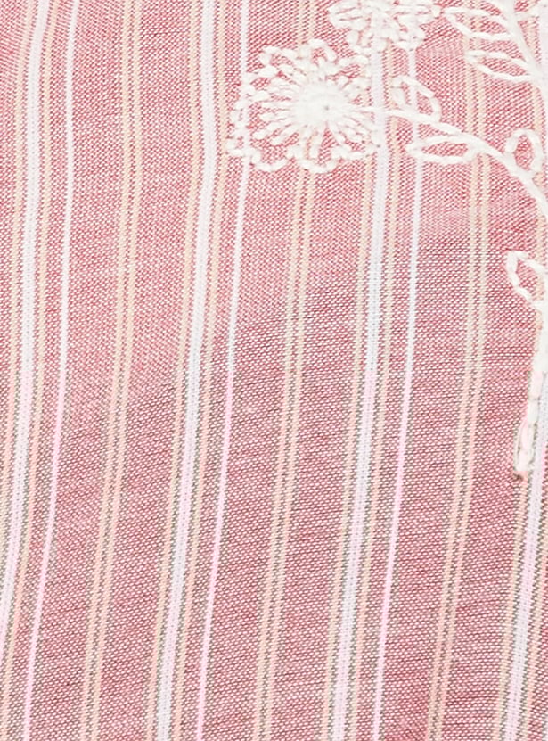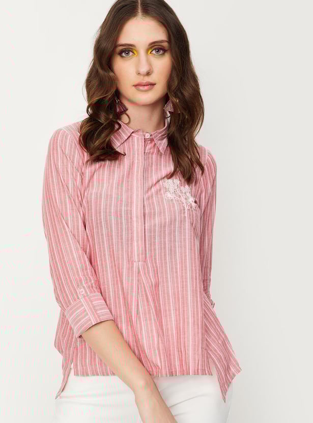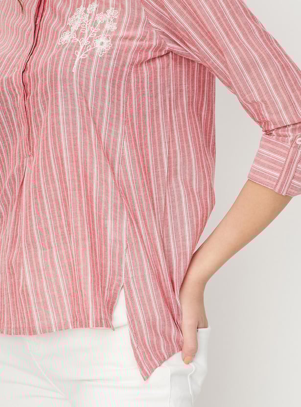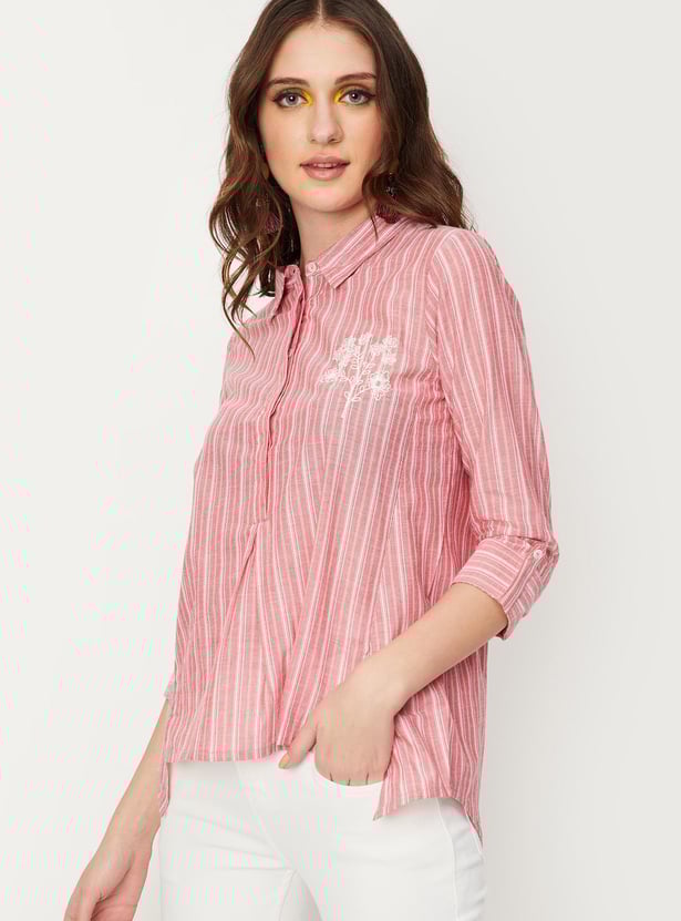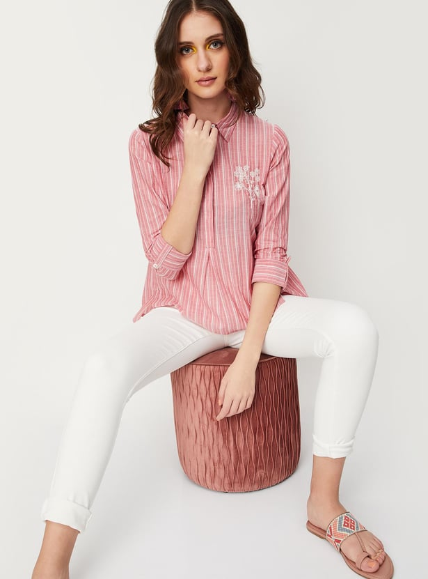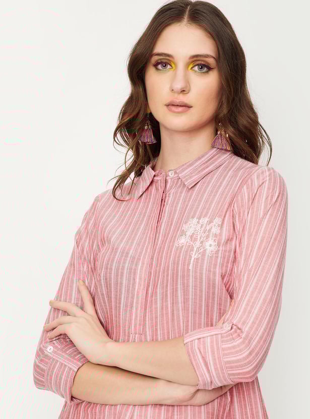 Amp up your style with this tunic that is designed with a striped pattern and floral embroidery at the chest. It features a collared neck, three-quarter sleeves with tabs, and a high-low hem. Style this tunic with jeans and flat sandals.
