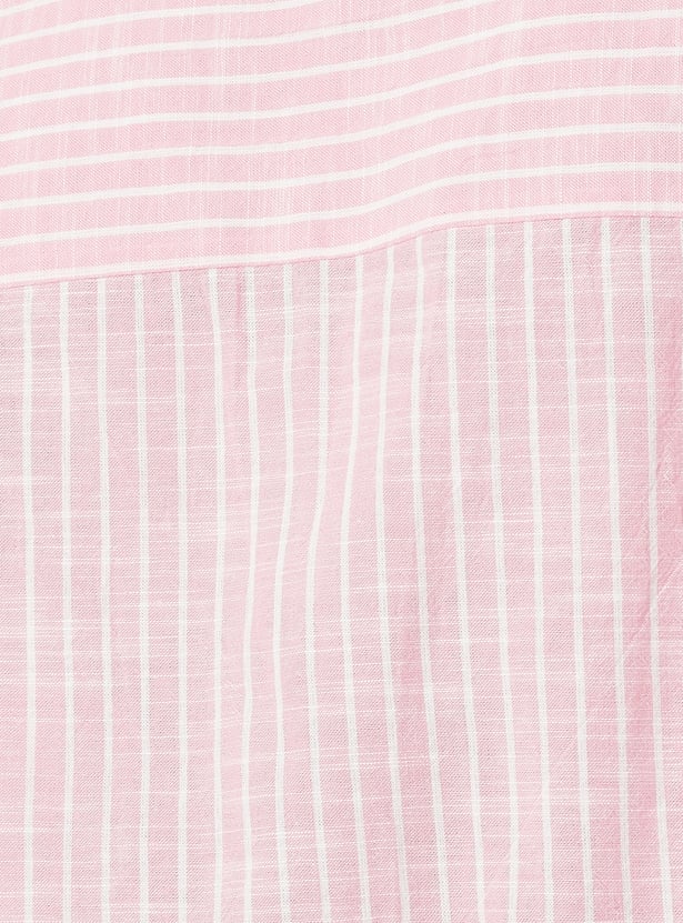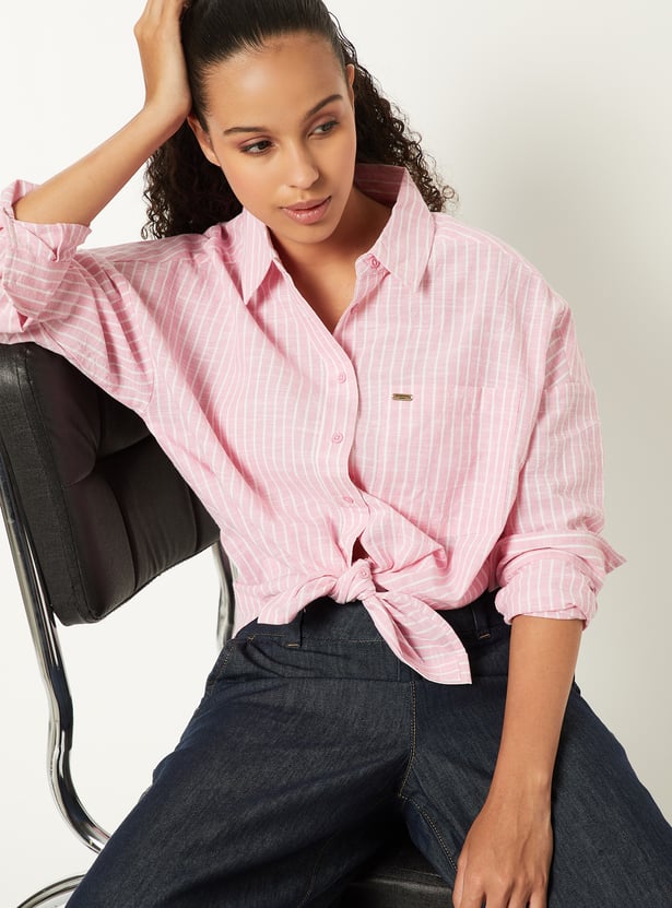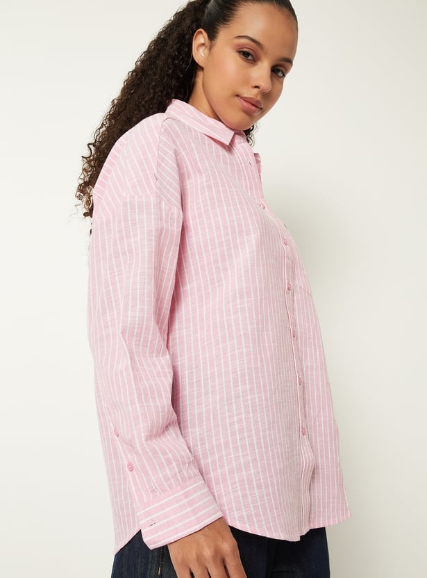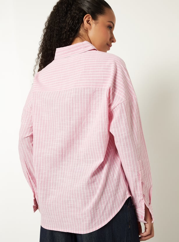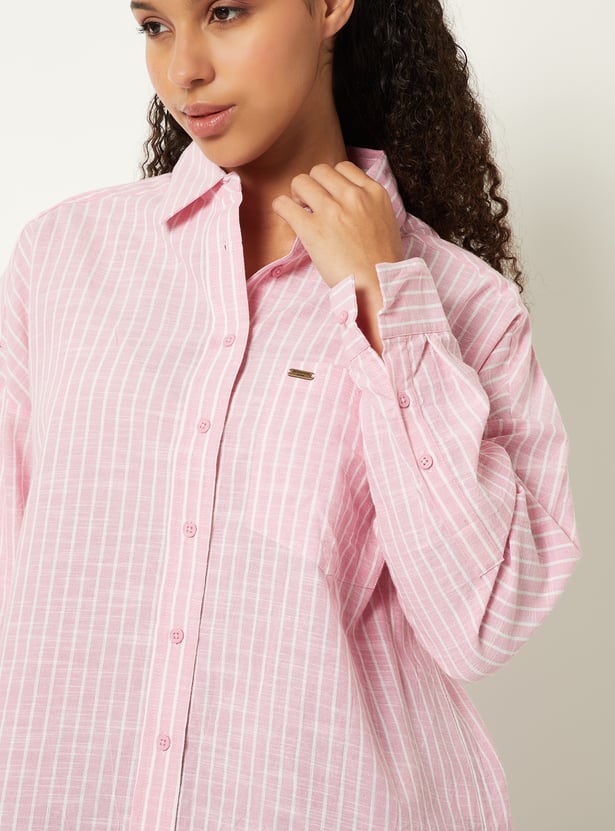 Elevate your casual wardrobe with this striped shirt designed for relaxed styling. Featuring an oversized fit, spread collar, full sleeves, and a classic button closure for effortless everyday wear. Model Size :