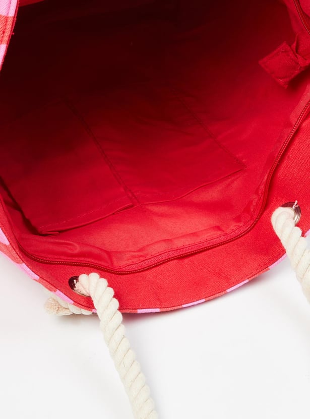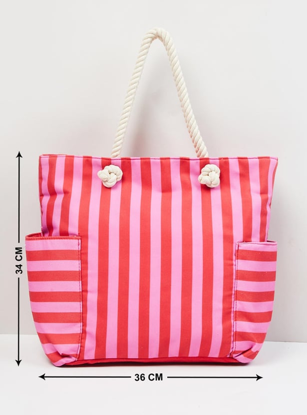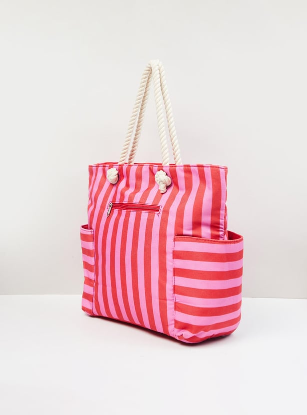 Designed with a striped surface, this tote bag features a spacious inner compartment and zip closure.