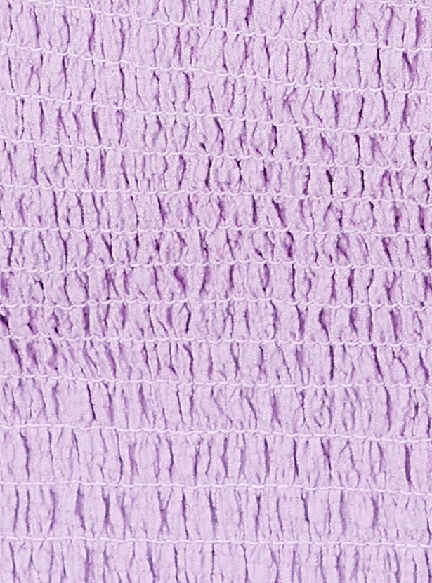 Look casual chic in this crop top with a textured surface and a smocked back. It features a tie-up neck, cap sleeves, and ruffled trim. Pair this top with denim shorts and sneakers to ace the look.