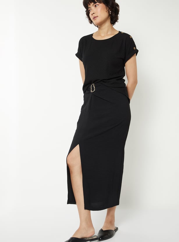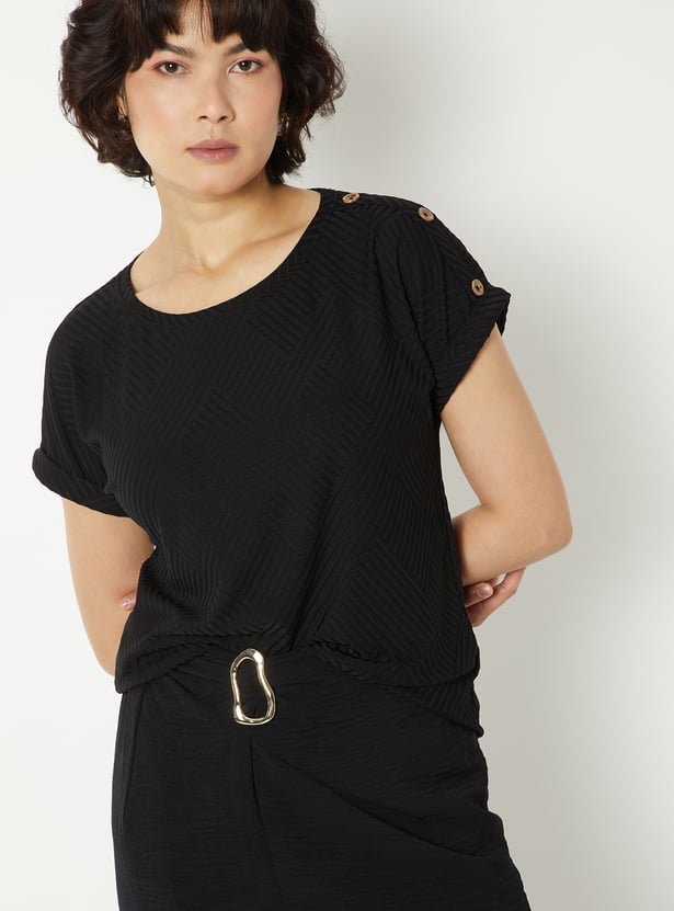 This round-neck top features shoulder button detailing, a regular fit, and a soft fabric for lightweight comfort and easy wear. Its subtly textured, knit design and short sleeves add a polished touch to everyday outfits. Model Size :