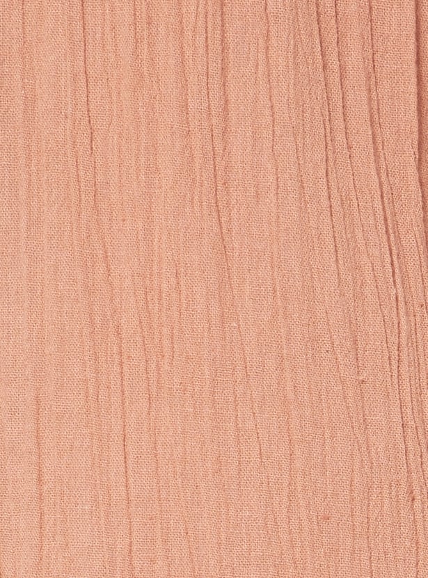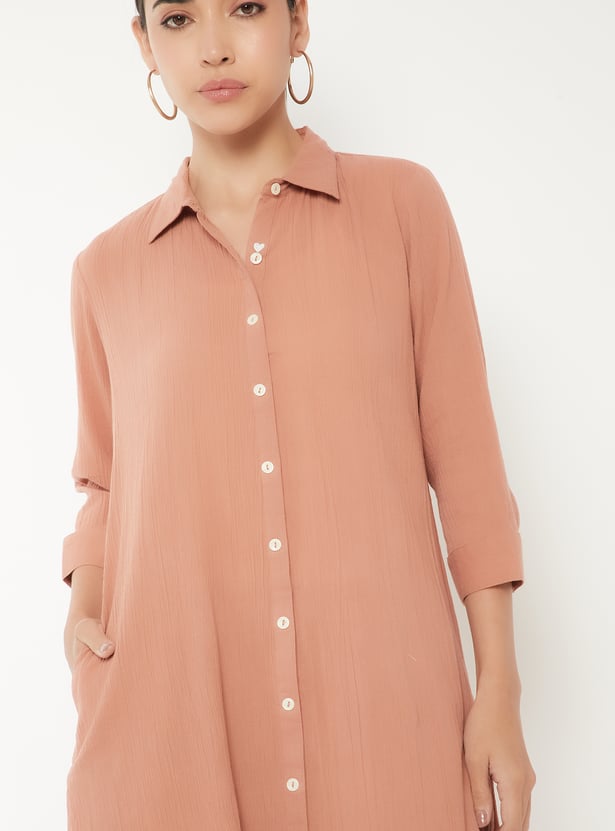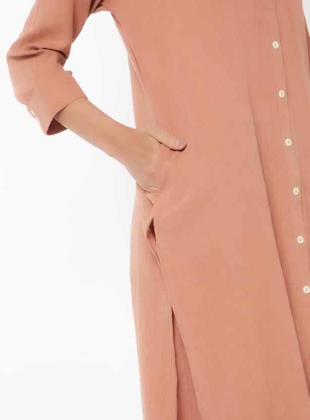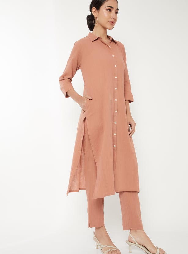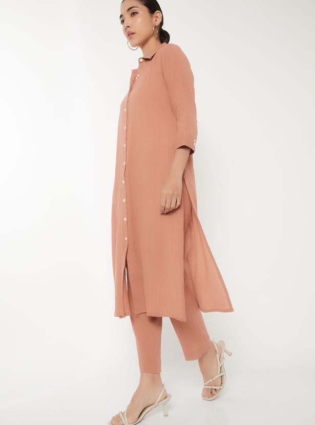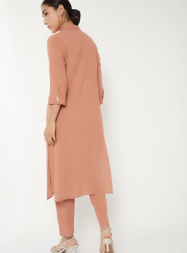Designed with three-quarter length sleeves, a spread collar, and a calf-length silhouette, this textured kurta is complemented by a pair of straight pants.