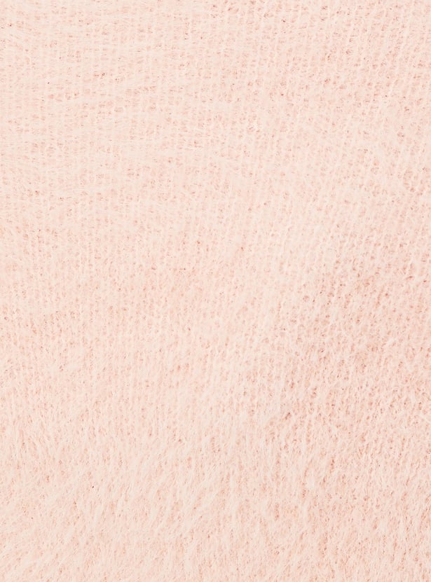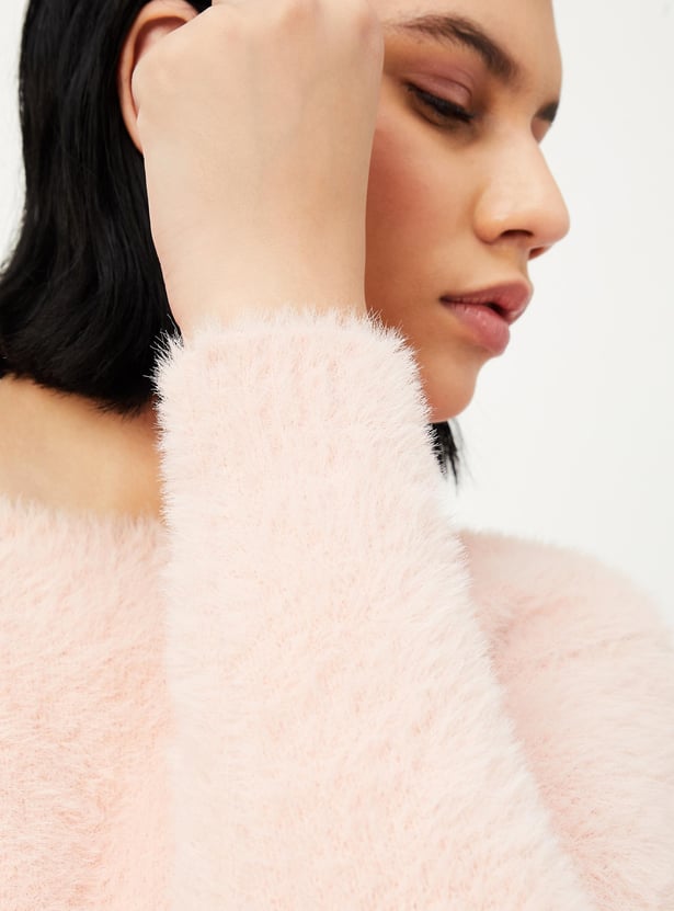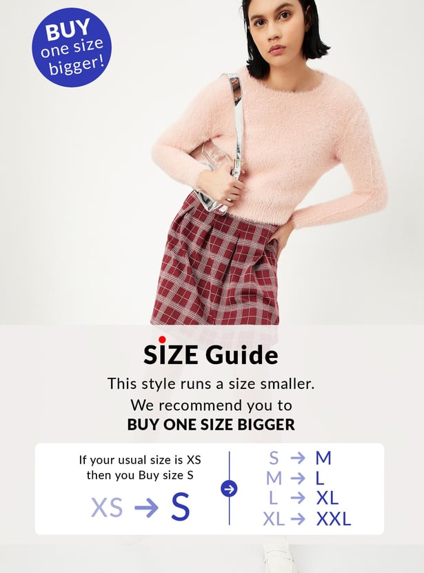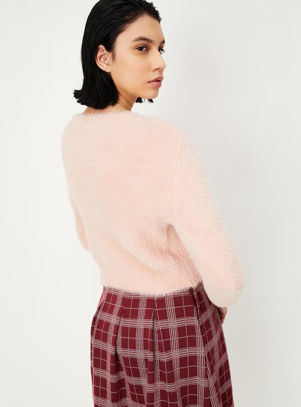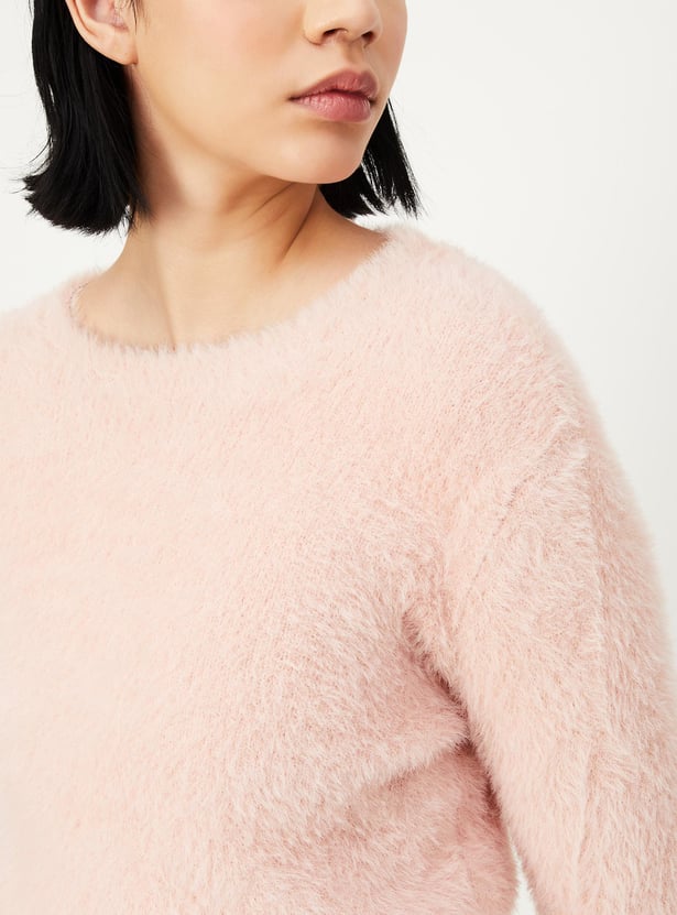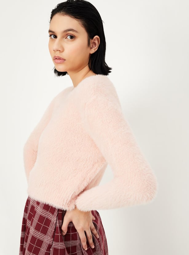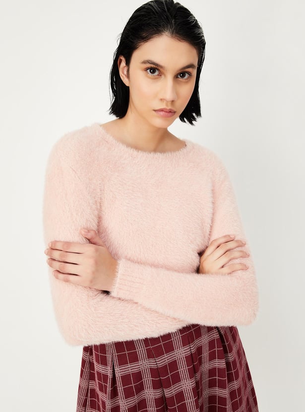 This sweater will keep you warm and fashionable throughout winter. It is designed with a textured surface, a round neckline, and full sleeves. To add a glamorous upgrade to your outfit of the day, team this sweater with a pair of treggings and boots.