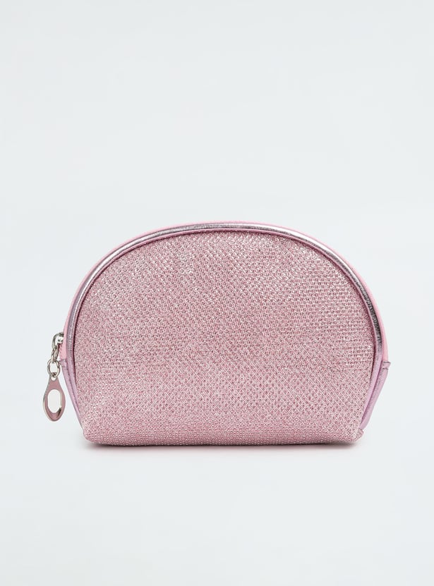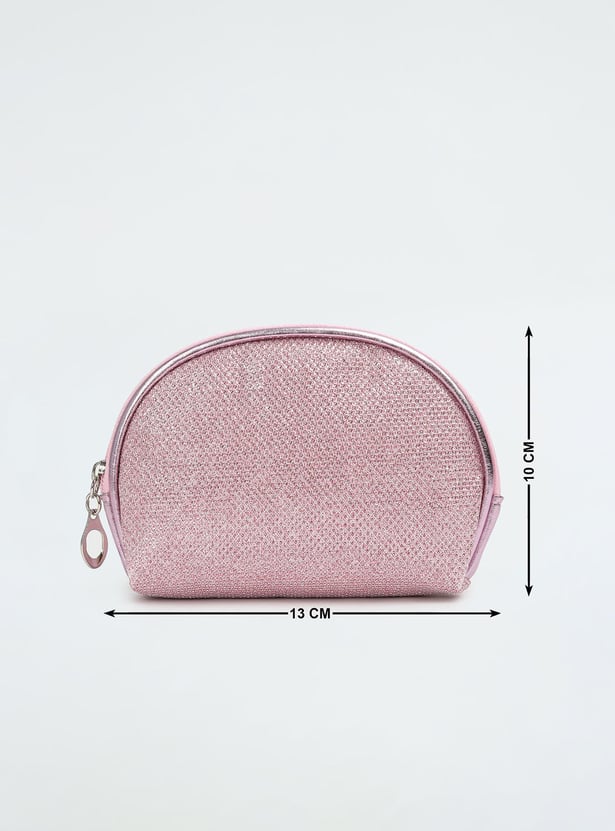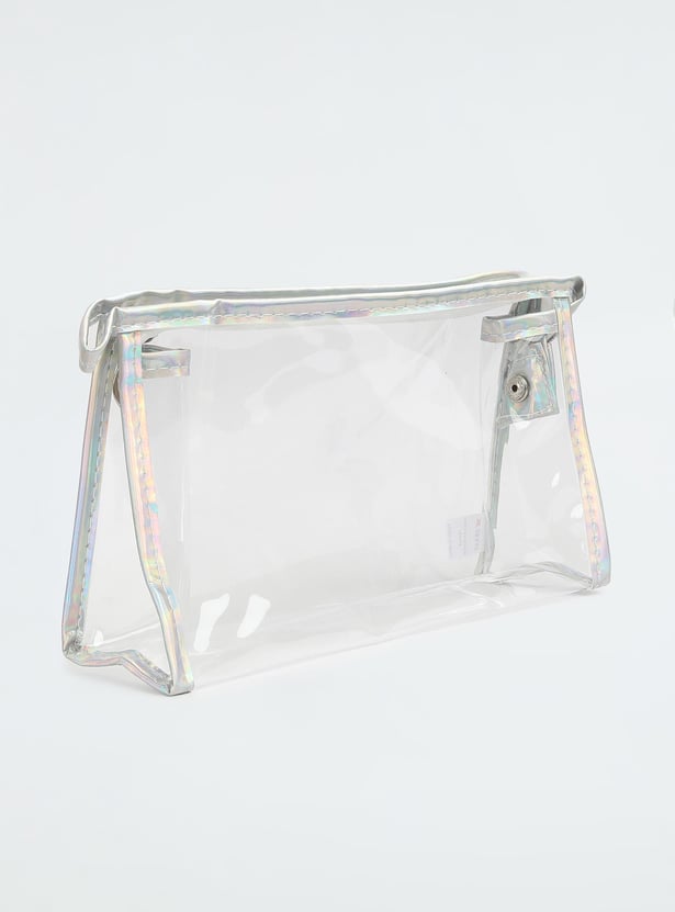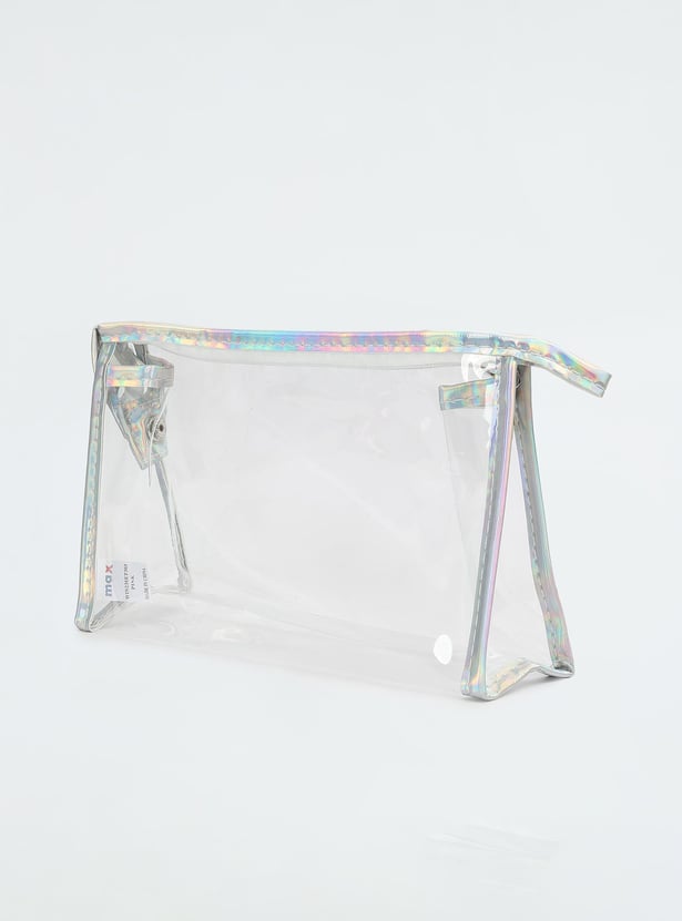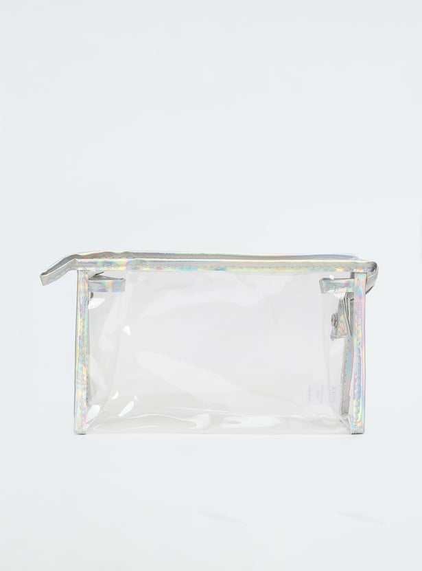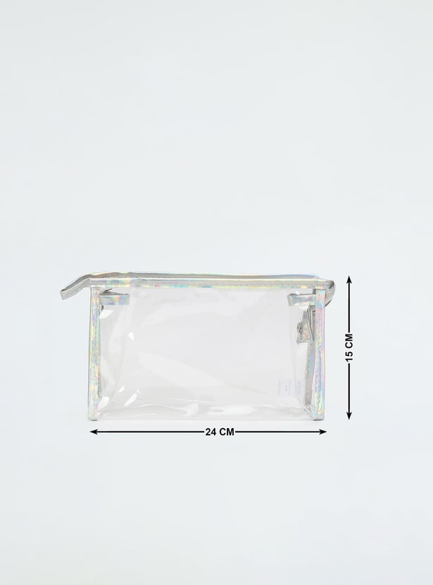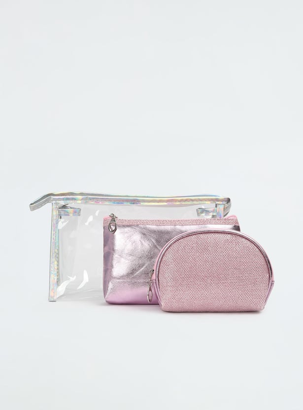 This set of 3 textured vanity pouches combines functionality with elegance, offering a versatile solution for organizing your essentials. The set has one transparent pouch, one solid pouch, and one textured pouch in three different sizes with a zip closure. The pouches feature a chic textured exterior, adding a touch of sophistication, while the varying sizes cater to different needs, from storing makeup to organizing travel essentials.