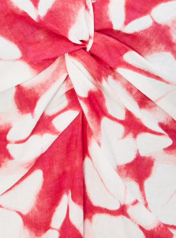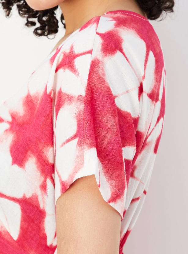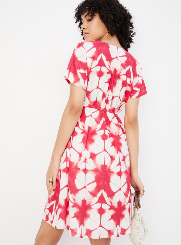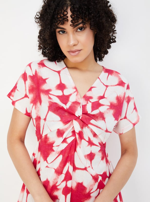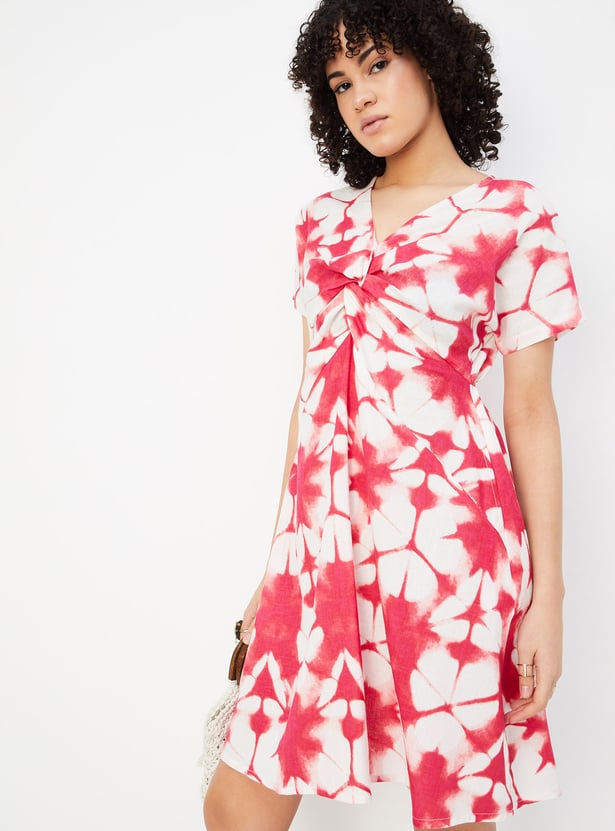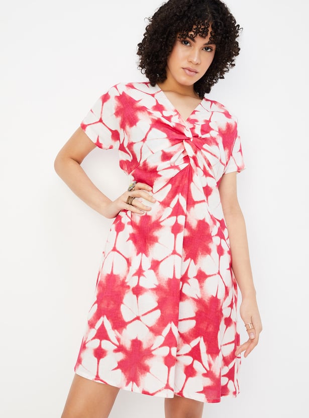 Dress to impress with this A-line dress. The tie and dye prints lend a vibrant flair. This dress is styled with a V-neck, half sleeves, twisted detail at the yoke, and a mini profile.
