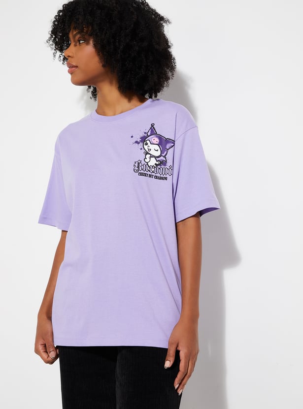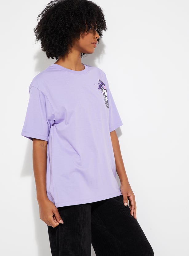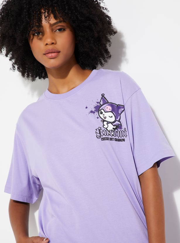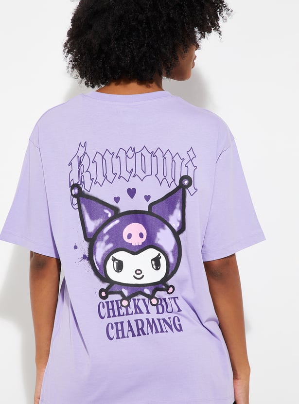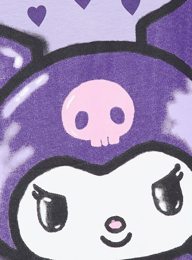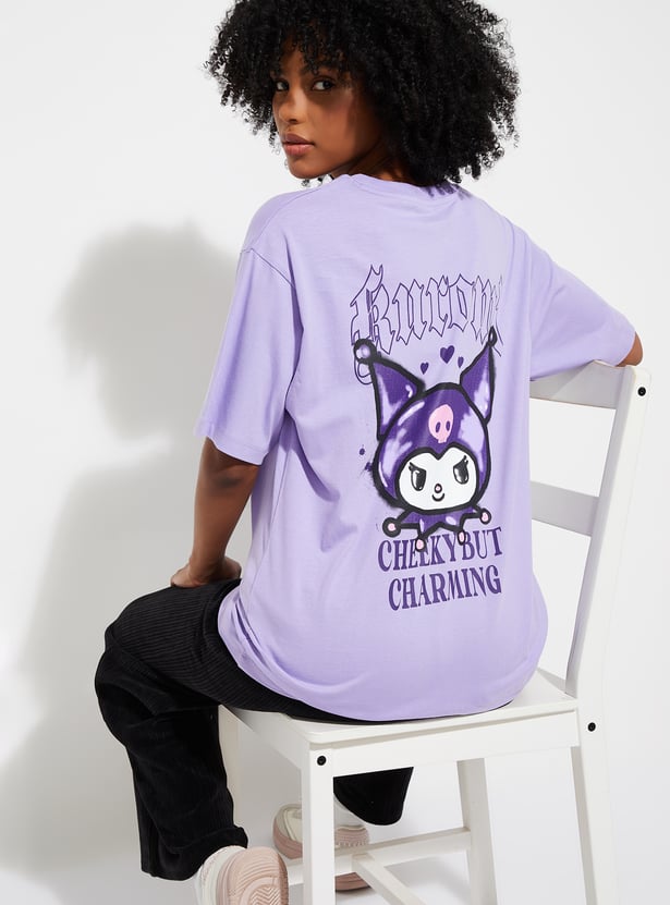 Add a playful edge to your casual wardrobe with this oversized T‑shirt featuring a fun Kuromi print. Designed with a classic round neck, drop shoulders, and half sleeves, it offers both comfort and a trendy streetwear vibe.