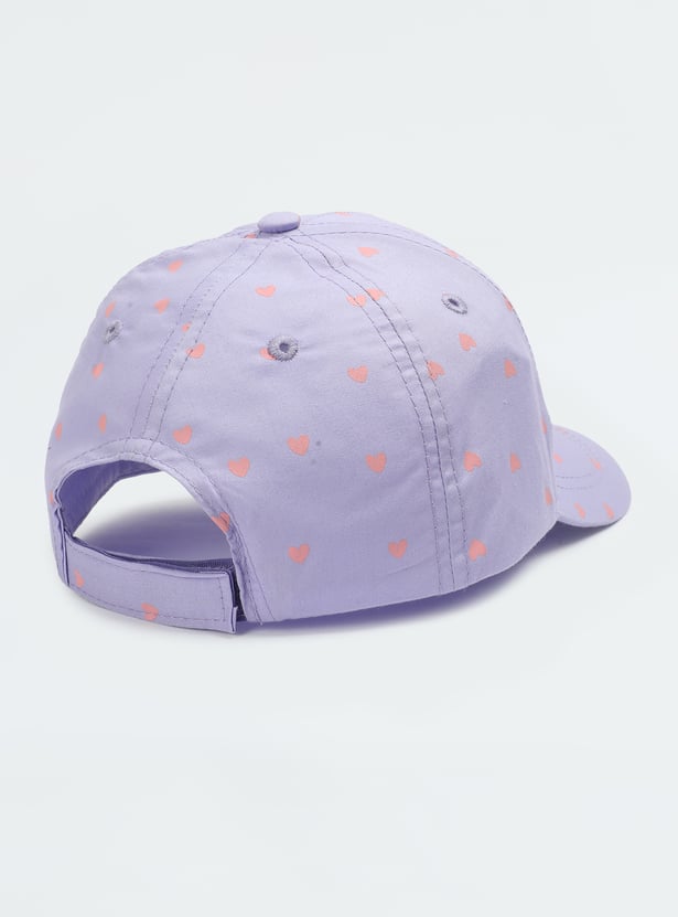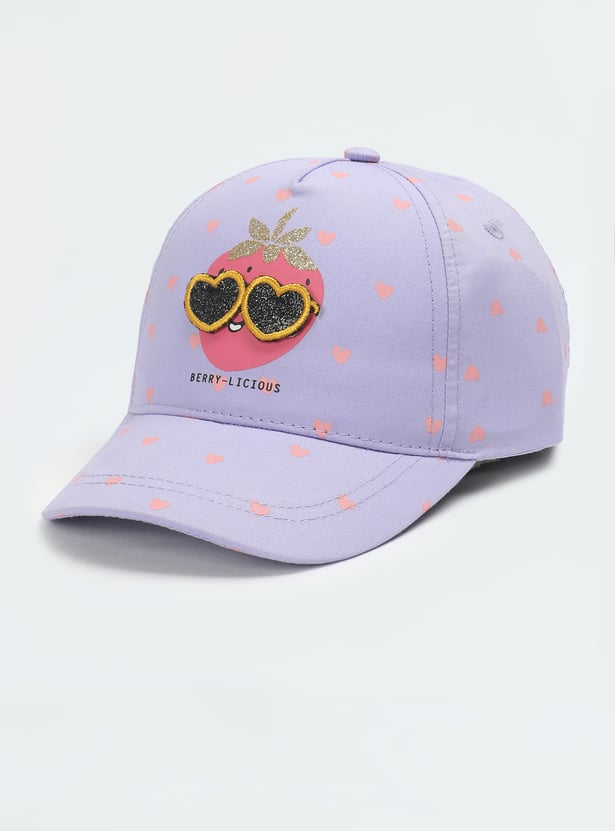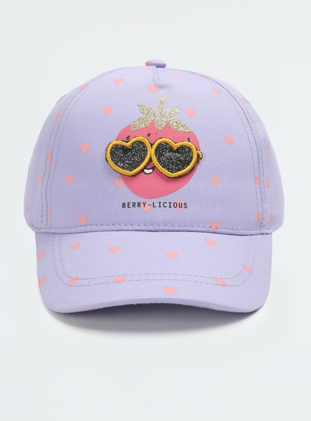 Jazz up her summer looks with this baseball cap. It is designed with a button accent at the top, strawberry applique, and an iridescent brim. The Velcro strap ensures a custom fit.