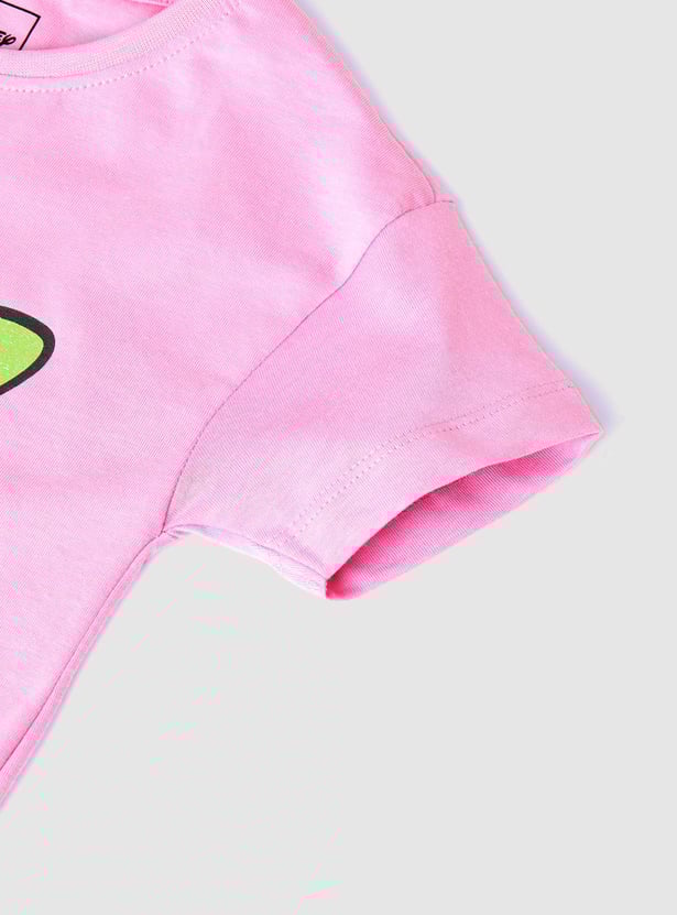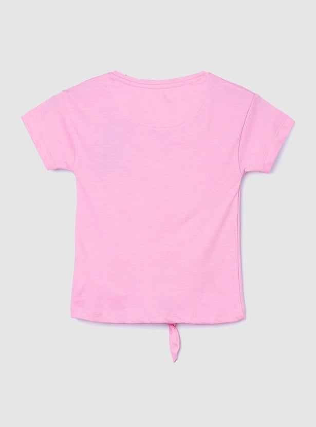 Match her fun spirit with this T-shirt. It is styled with a round neck and half sleeves. The Daisy Duck graphic print with metallic detailing jazzs up the style. The knotted hem offers a trendy, flattering finish.