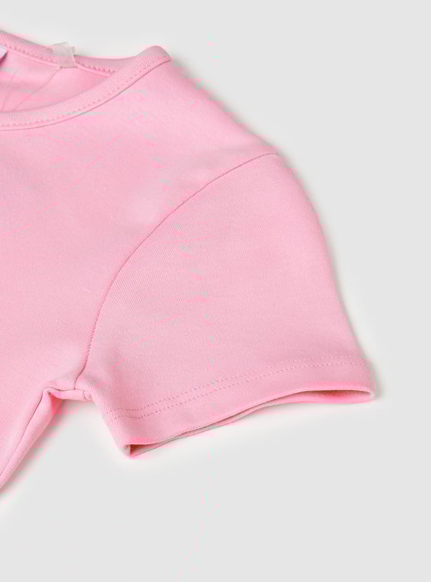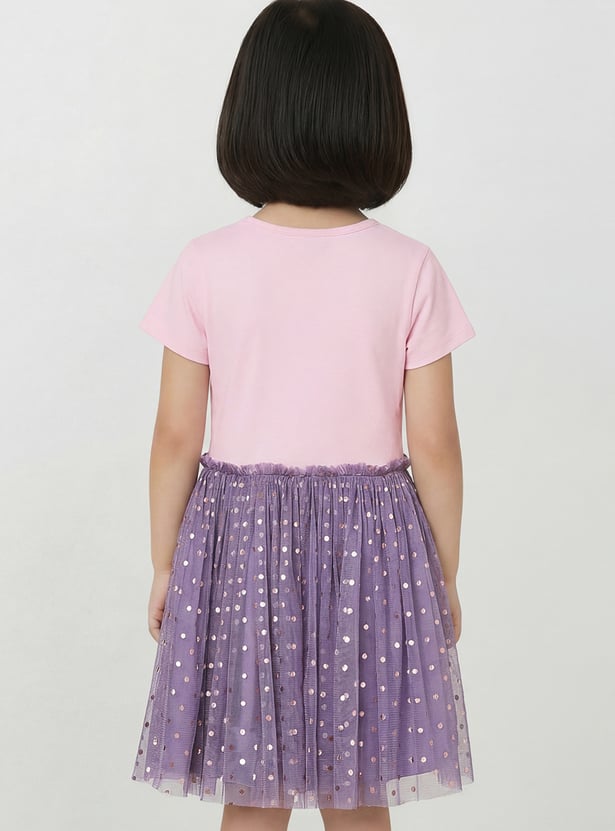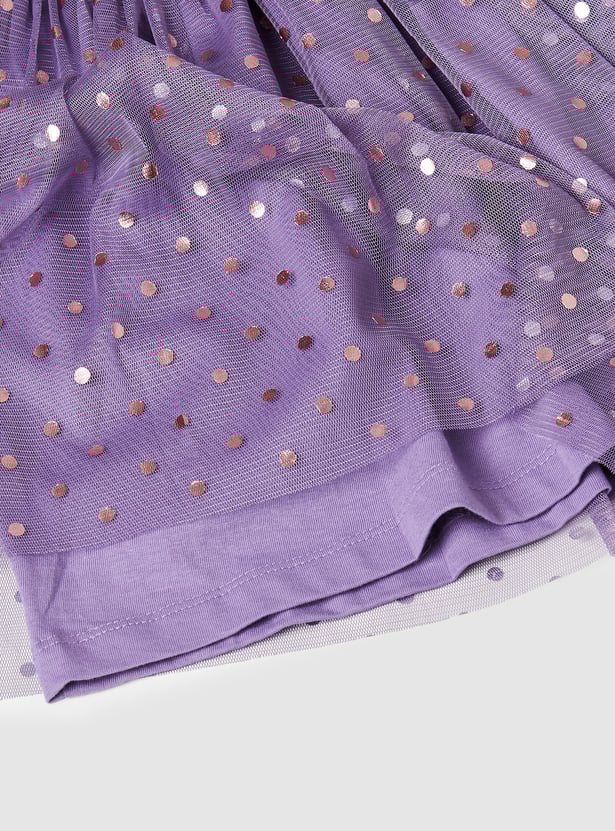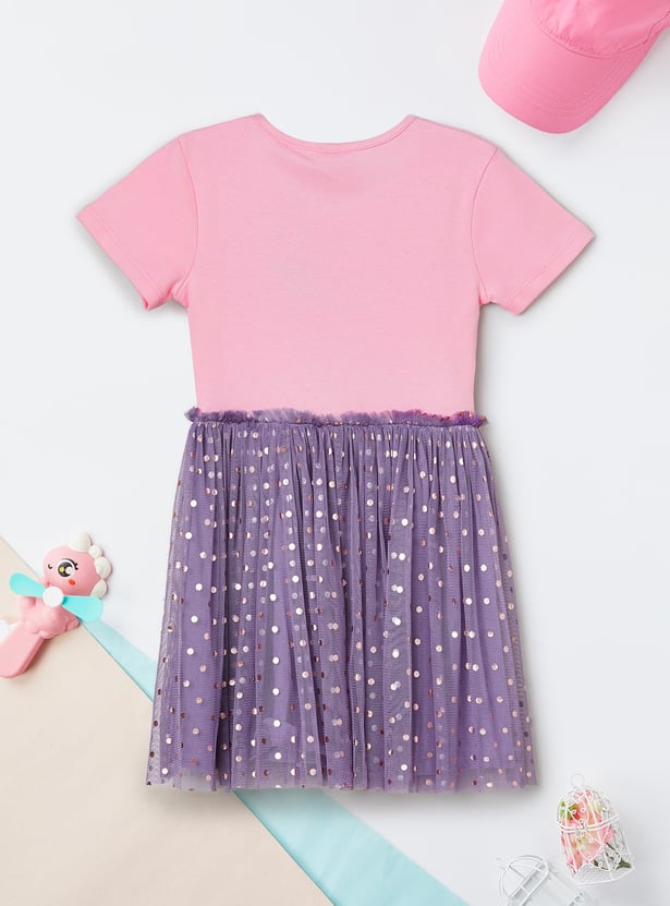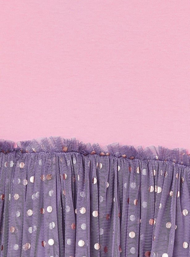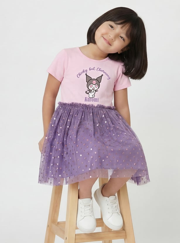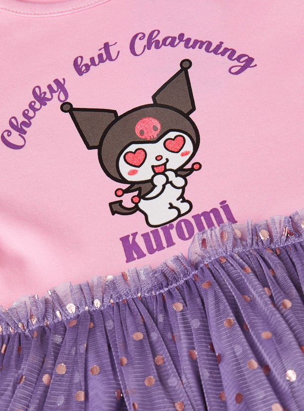Add a playful character touch to her wardrobe with this party dress. Designed with a round neck and half sleeves, it features a Kuromi print on the bodice. The tulle skirt with metallic polka dots adds a fun, sparkly finish perfect for special outings.