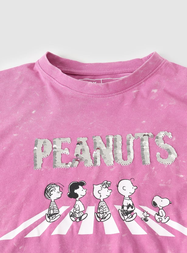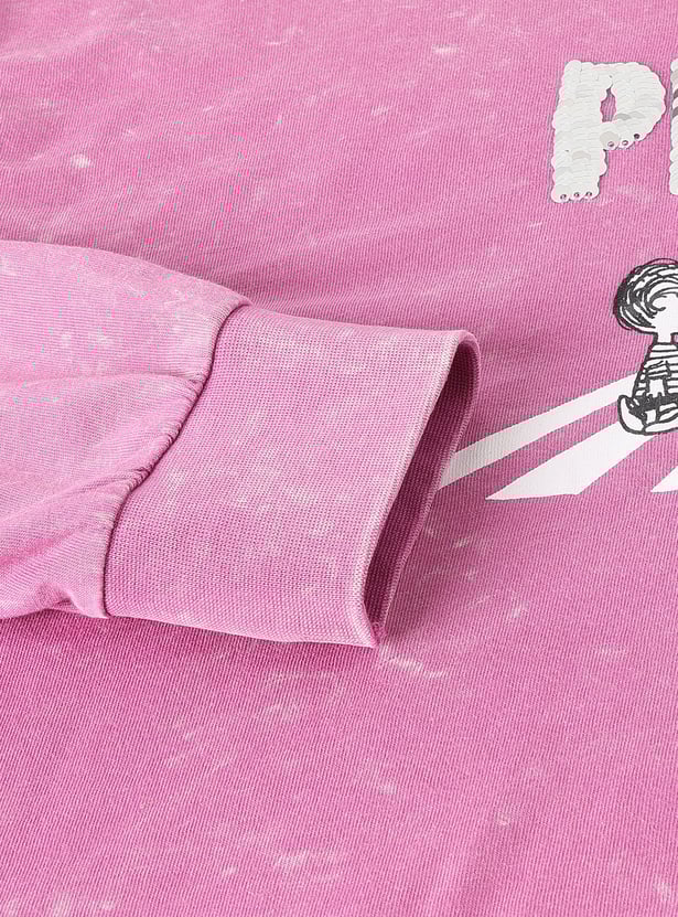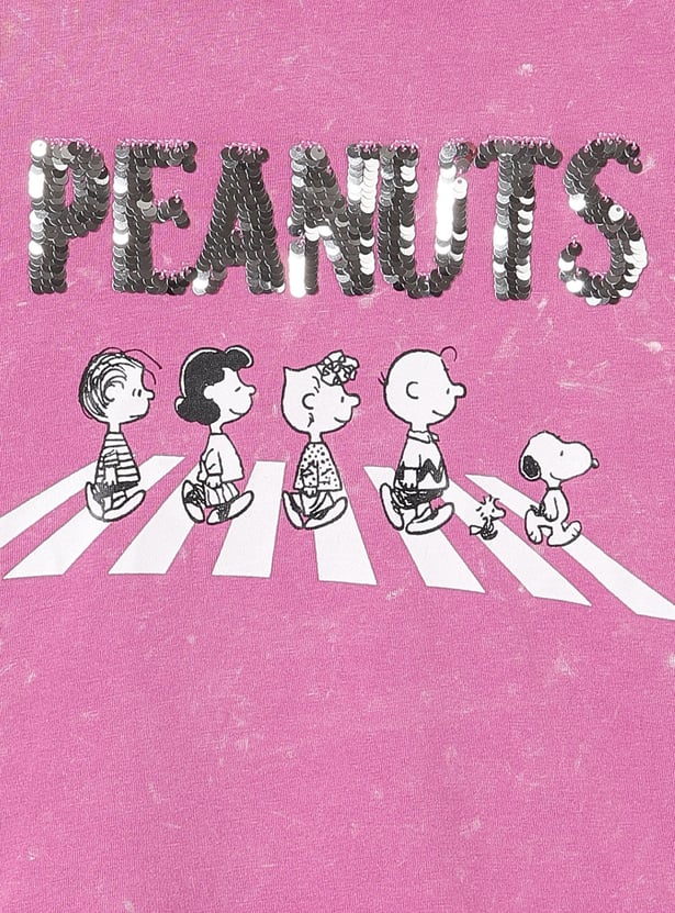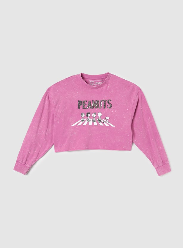 Add some sparkle to her day with this T-shirt. It features a playful Peanuts graphic with sequin detailing for a jazzed-up look. This tee features a round neck, full sleeves, and ribbed cuffs.