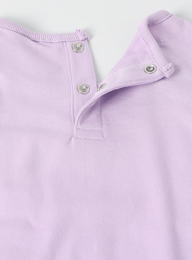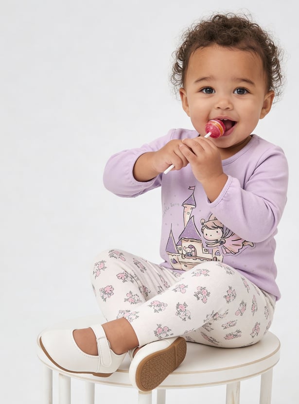 This girls’ printed leggings set includes a full-sleeve round neck top with a back button closure and all-over printed full-length, mid-rise leggings. Designed with an elasticated waist for comfort, this coordinated set blends playful prints with easy everyday wearability.