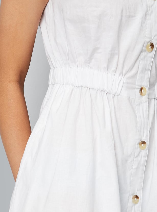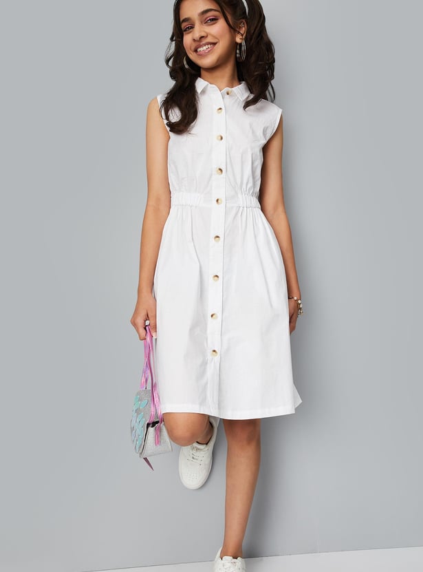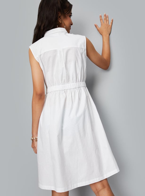 Nothing says summer like this shirt dress. It has a collared neck, elasticated waist, sleeveless construction, and a curved hem. Team up this dress with sneakers for a casual chic look.