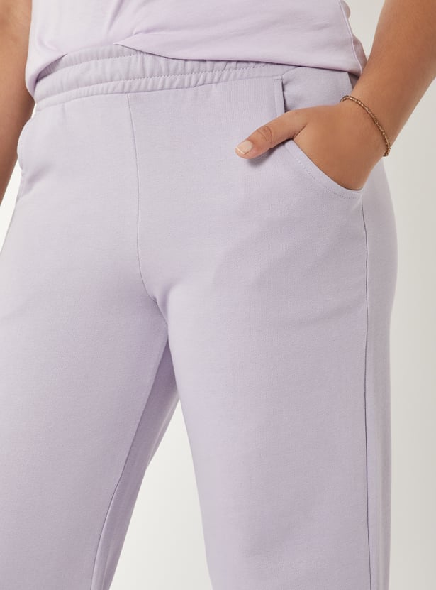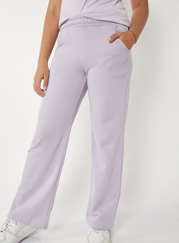 Stay comfortable and active in these solid track pants, designed with a mid rise elasticated waist for a secure fit and side pockets for added convenience. A must-have for workouts, lounging, or everyday wear.