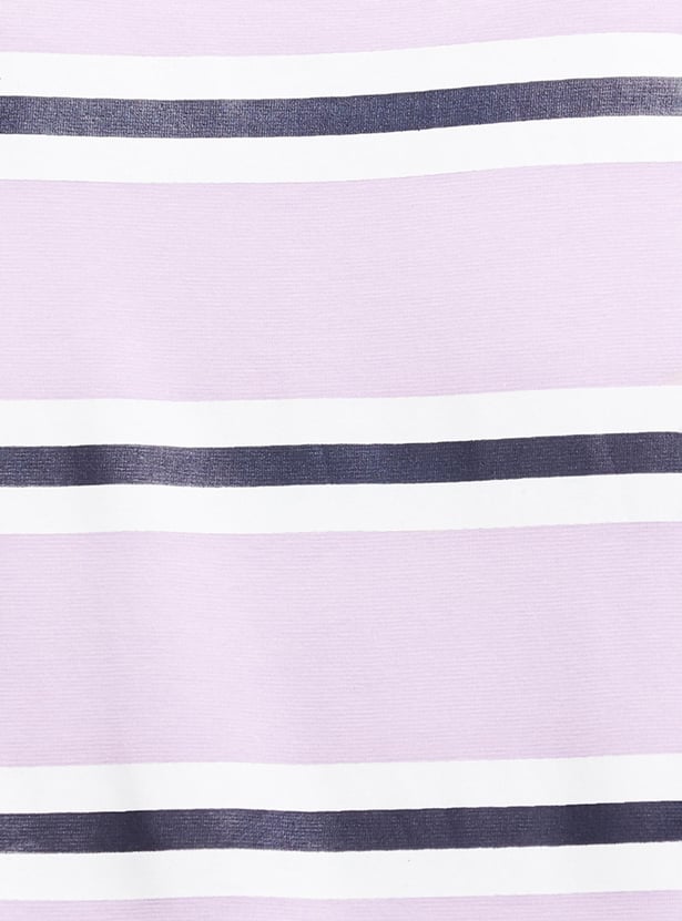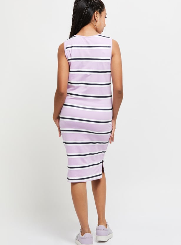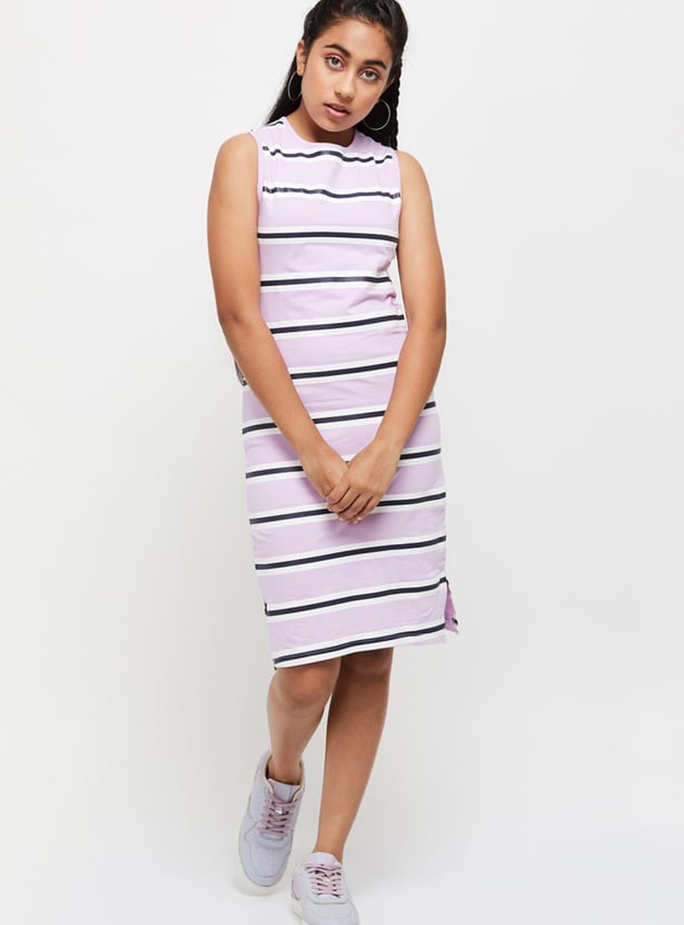 Be it an outing with friends or a casual event, your child is going to put her best foot forward with this t-shirt dress. It flaunts a striped surface, sleeveless construction, round neck, and a midi silhouette.