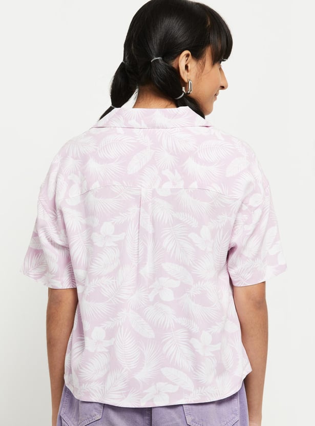 Girls Botanical Print Lapel Collar Shirt