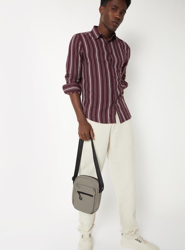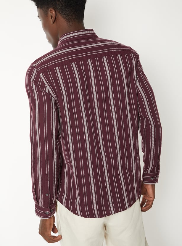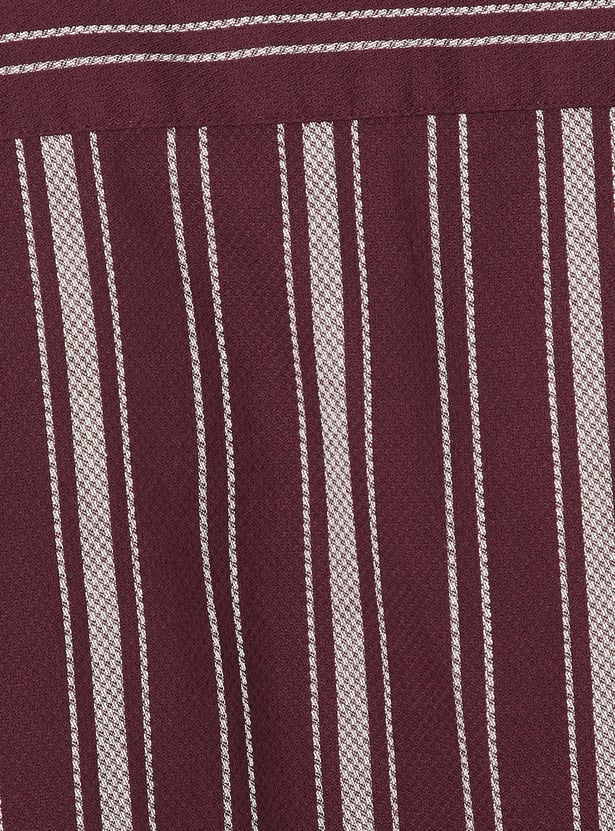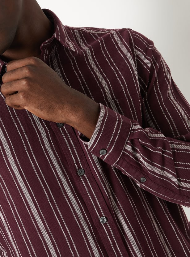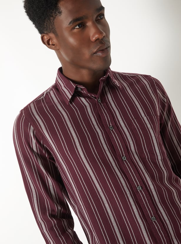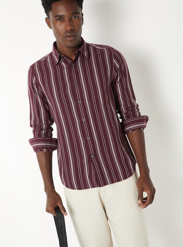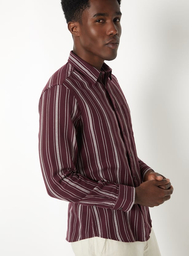Step out in smart style with this striped slim fit shirt. Featuring a spread collar, button closure, full sleeves with button cuffs, and a tailored fit, it combines classic patterns with modern tailoring.