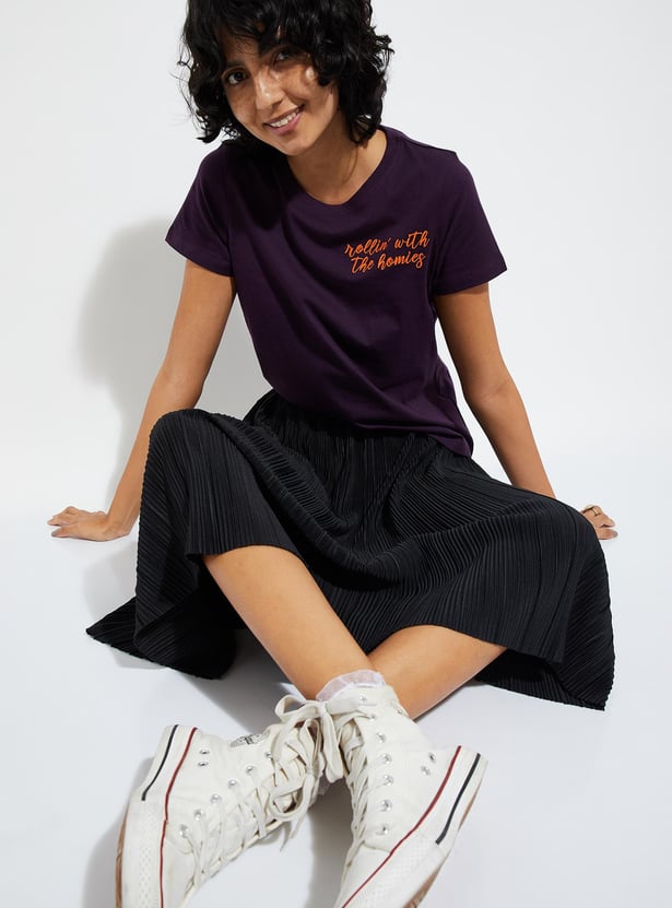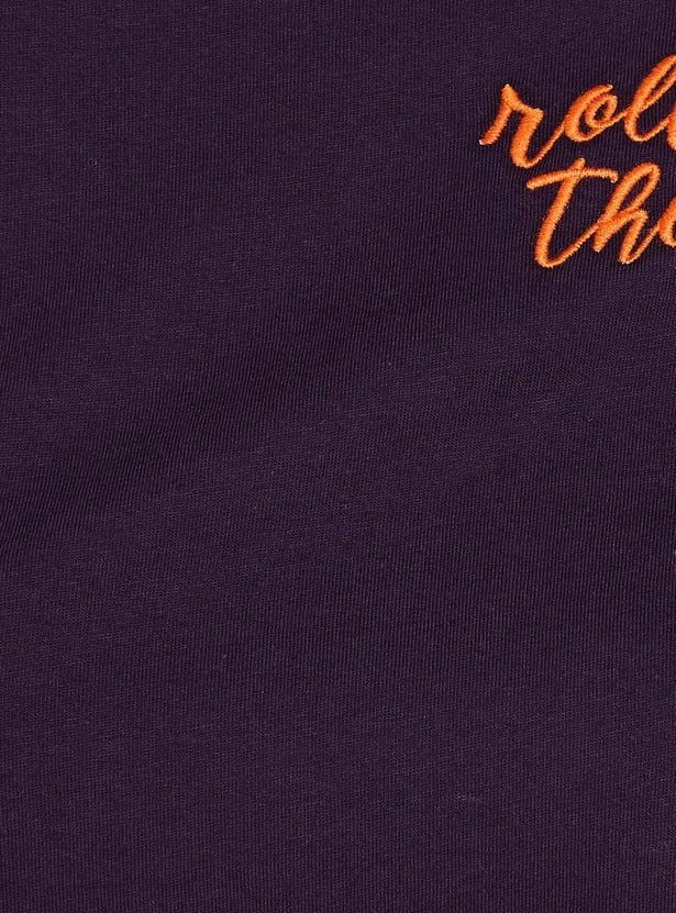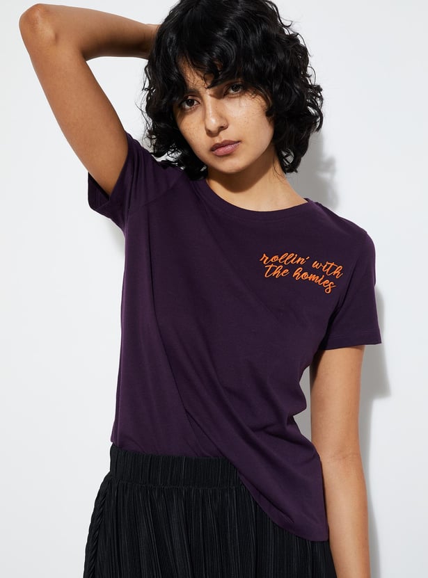 Upgrade your casual ensemble with this oversized T-shirt, adorned with embroidered text on the chest. Complete with a round neckline and half sleeves, it adds a stylish touch to your laid-back look.