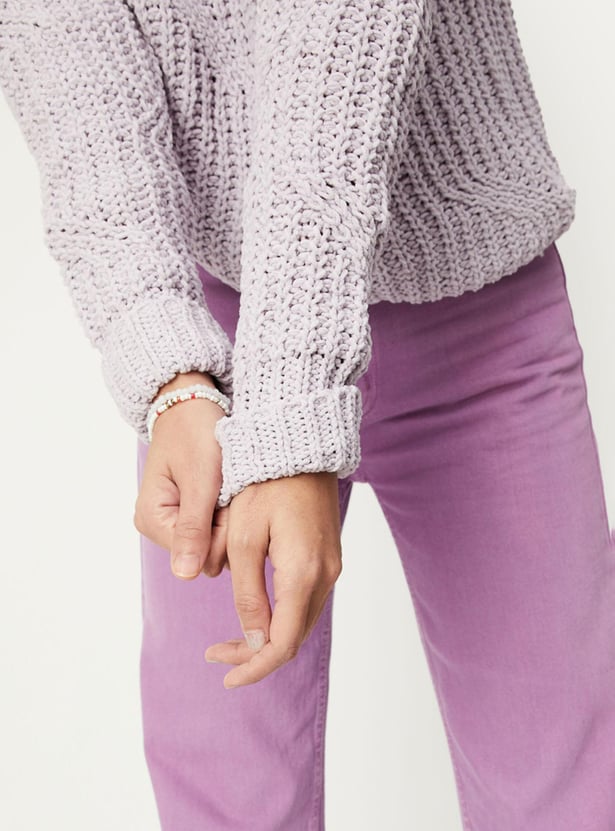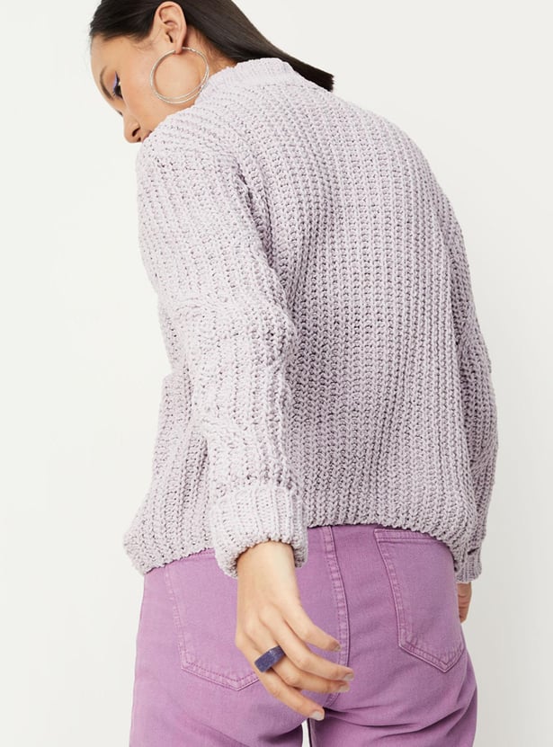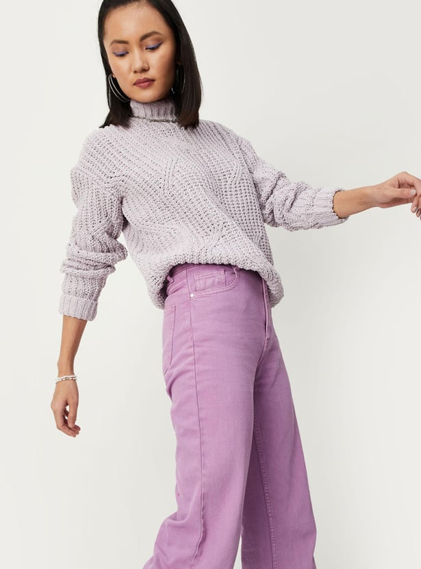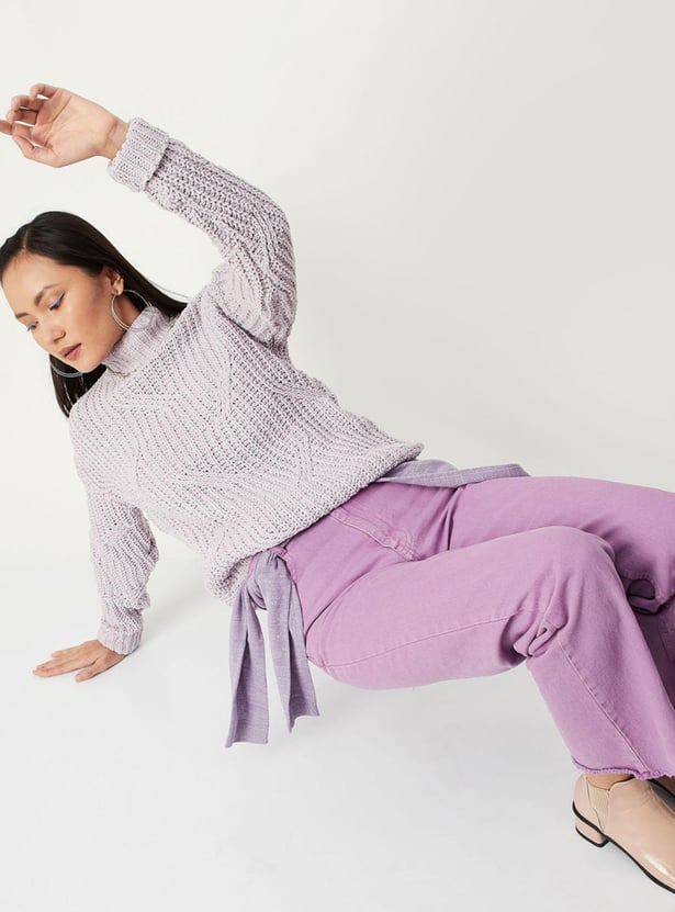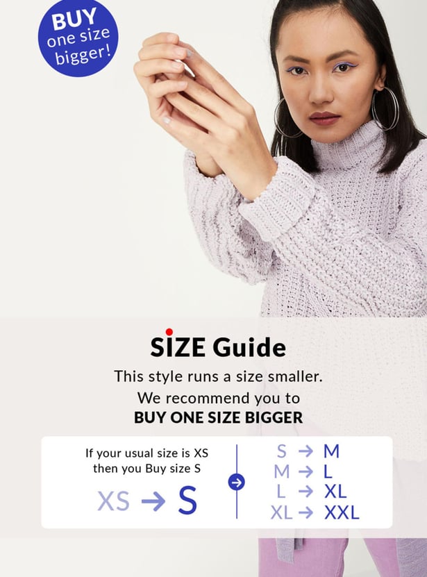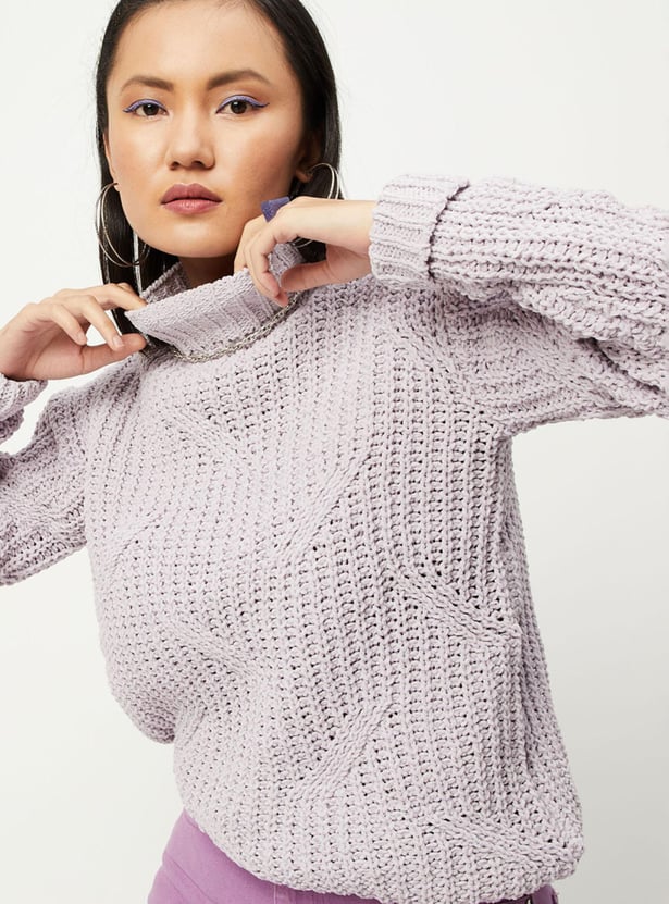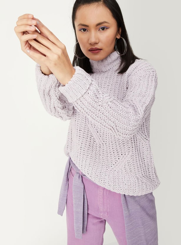 Exude warmth and cosiness on a chilly day with this sweater. This chunky sweater features a cable knit pattern, boxy profile, turtleneck and long sleeves. Look winter-ready by teaming up this sweater with denim and ankle boots.