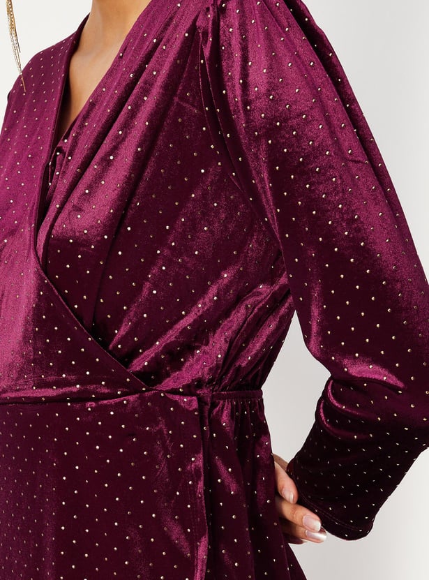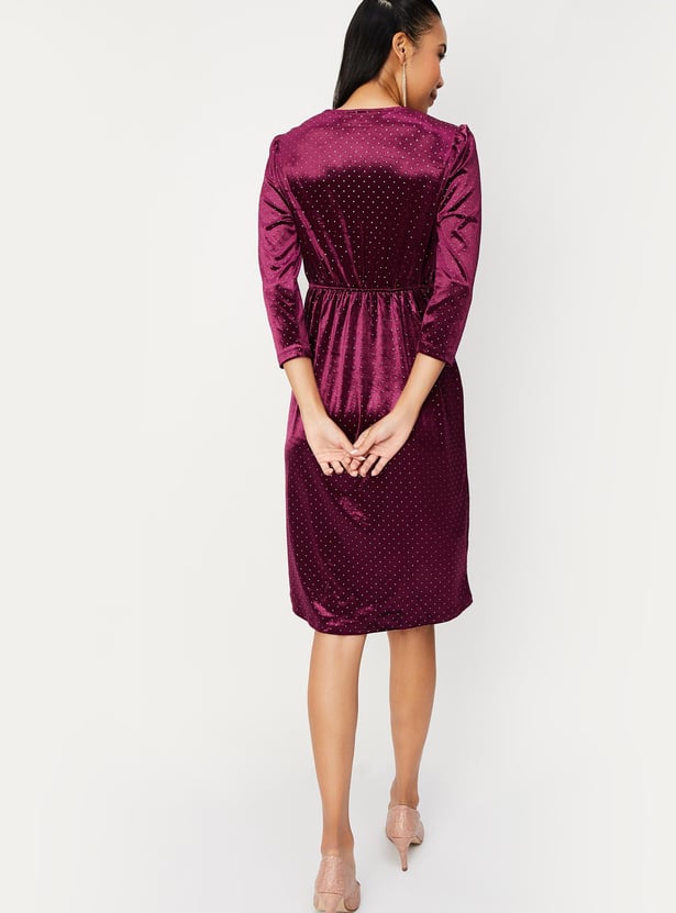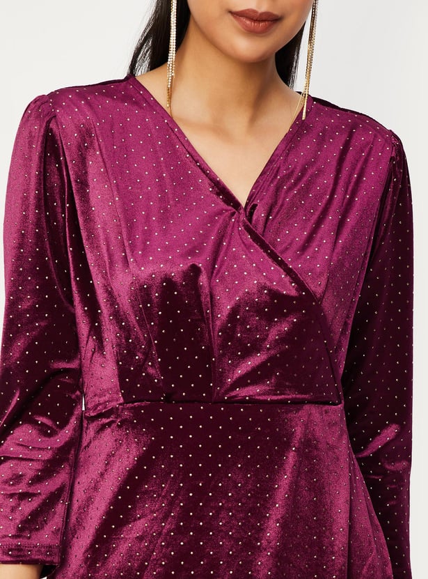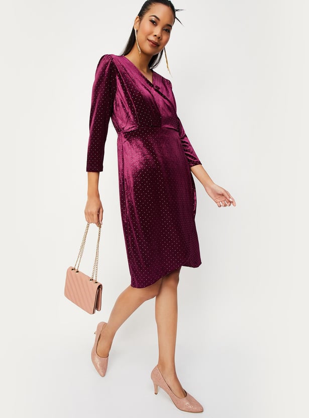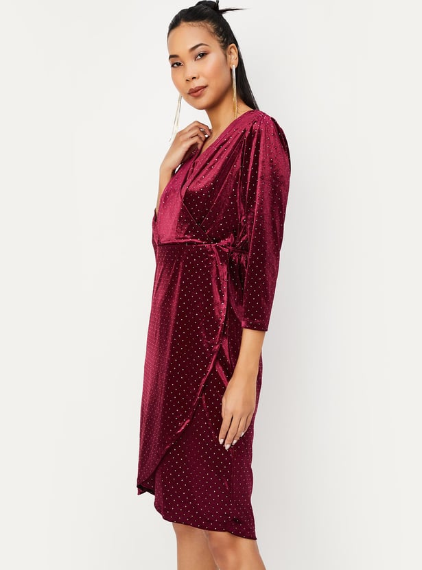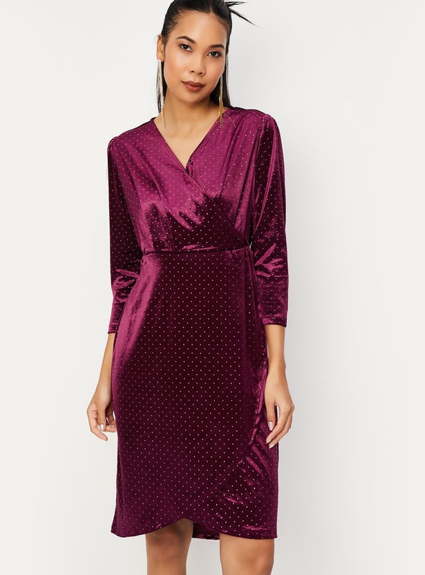 Flaunt like a dive in this velvet dress. It is crafted in a wrap profile with a surplice neckline, three-quarter sleeves, and a tulip hem. Add a pair of heels to this dress to make a chic statement.