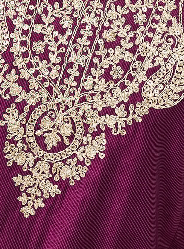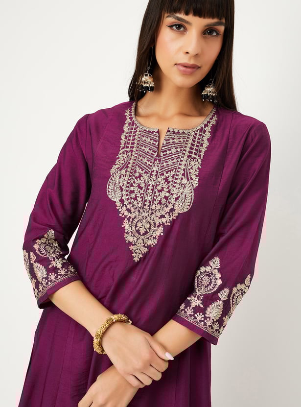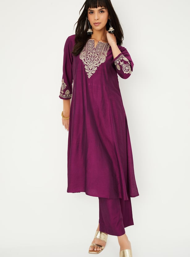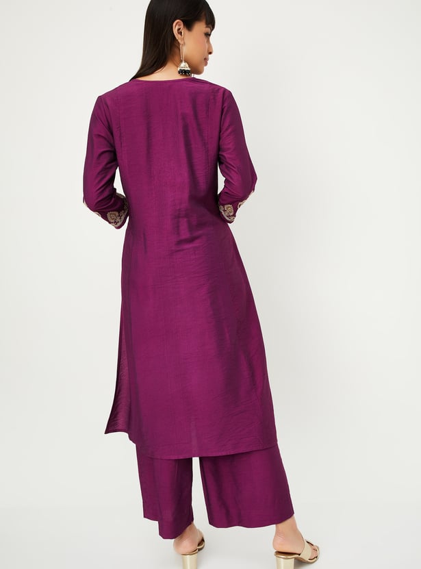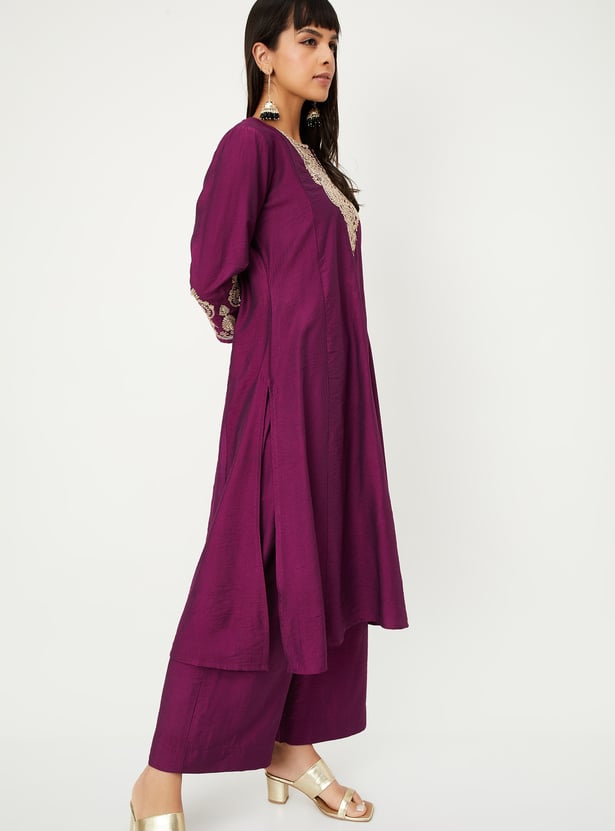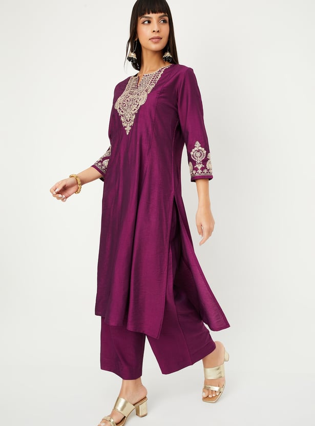 Step out in effortless elegance with this embroidered kurta set. The kurta features a notch neck, 3/4th sleeves, and side slits, while the matching palazzos come with an elasticated waist for all-day comfort.