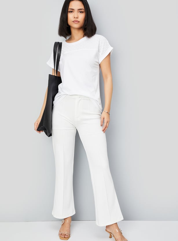 Add a touch of elegance to your wardrobe with this embroidered panel top. Featuring half sleeves and a round neck, it offers a simple yet sophisticated look, elevated by the intricate embroidery. Model Size :