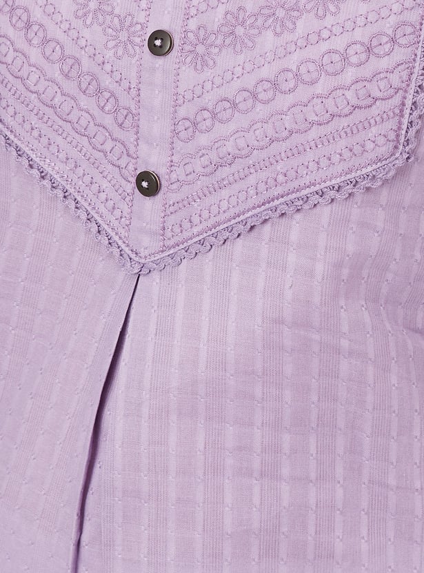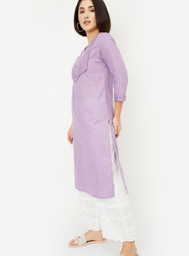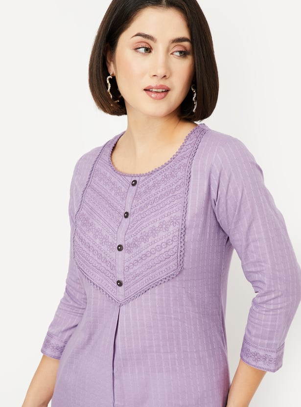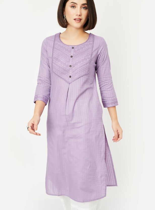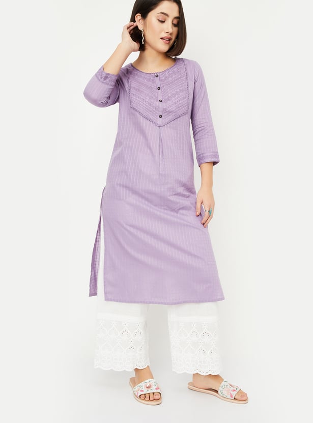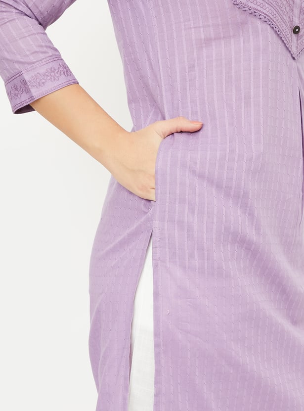 Elevate your style with this beautifully striped yoke embroidered straight kurta. The delicate embroidery on the yoke adds a touch of elegance, while the side slits and pockets offer both comfort and functionality. The round neck and 3/4th sleeves make it perfect for all-day wear.
