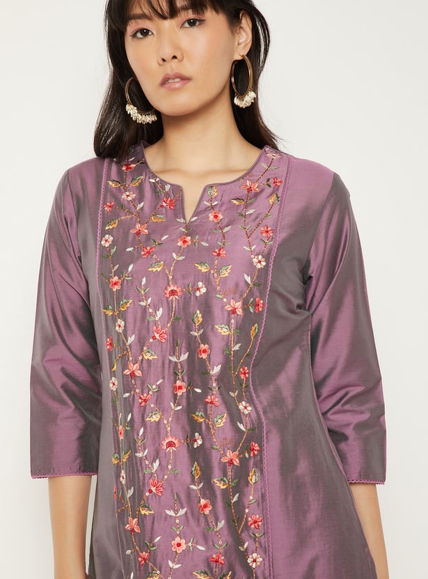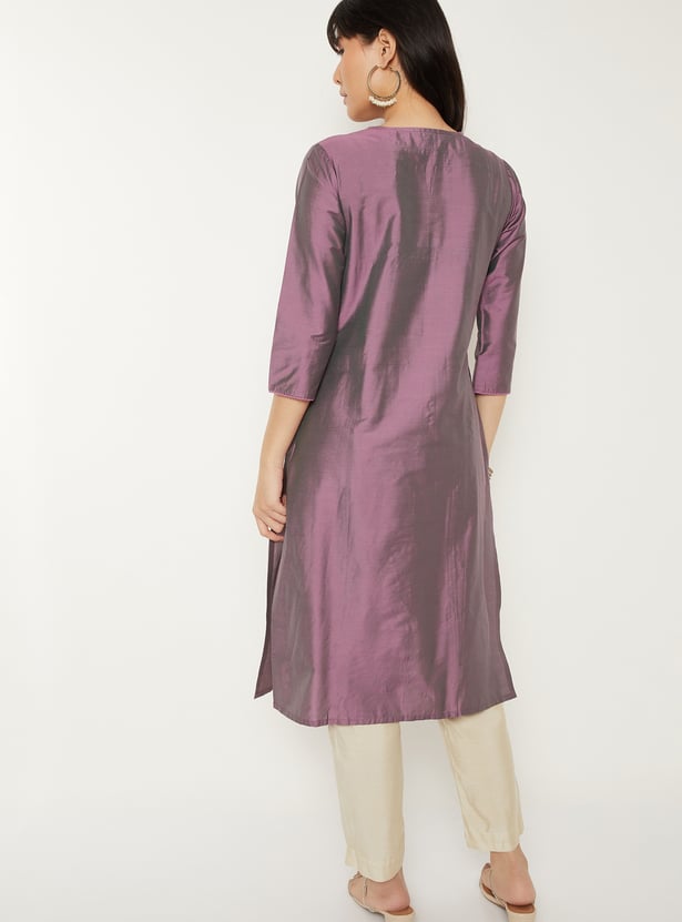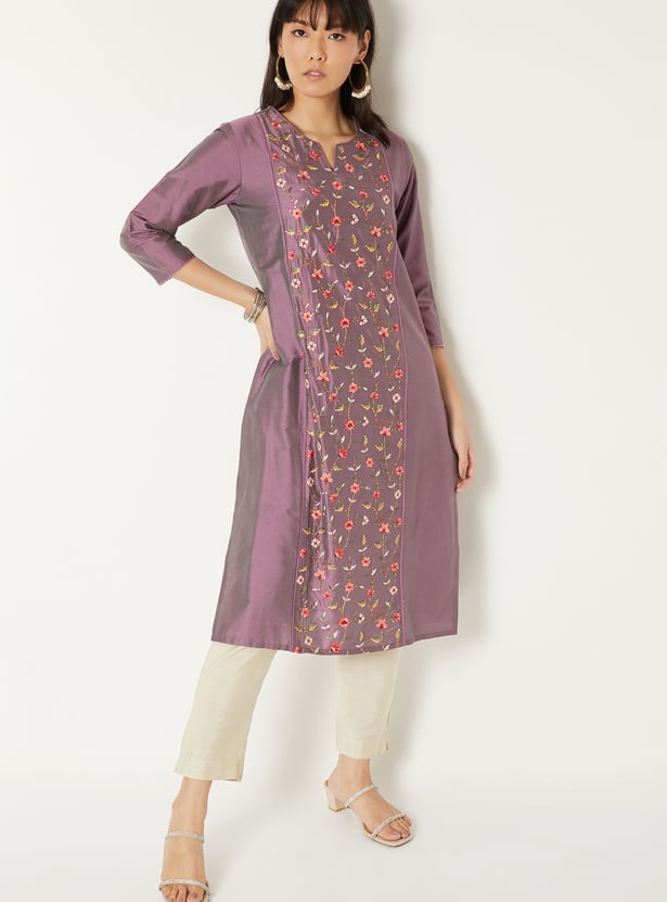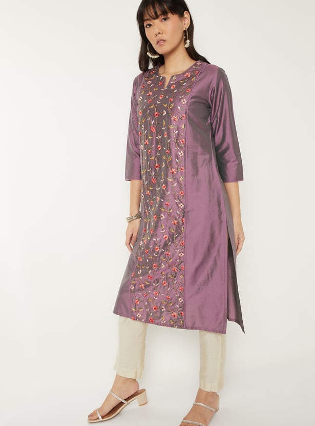 Elevate your everyday style with this embroidered straight kurta, featuring a flattering V-neck, 3/4th sleeves, and side slits. Its elegant detailing and classic silhouette make it a versatile choice for both casual and festive wear.
