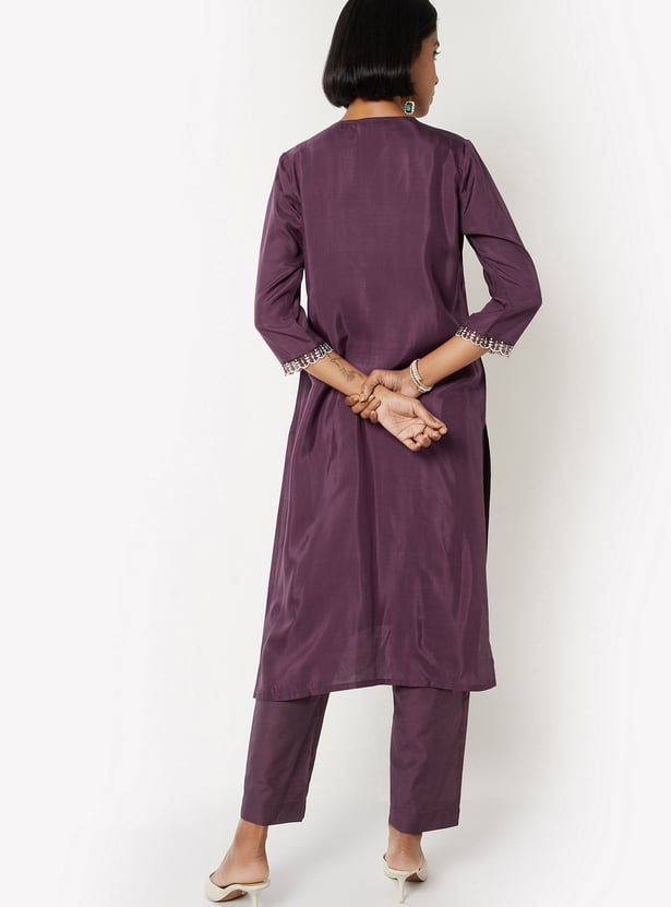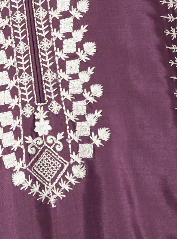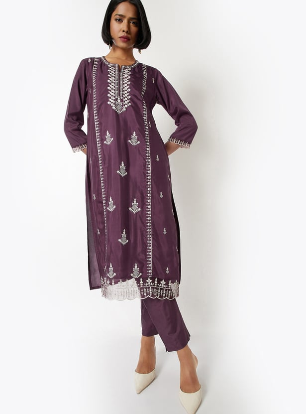 Step into effortless elegance with this embroidered straight kurta set. Featuring a round neck, side slits, and 3/4th sleeves, the kurta pairs beautifully with elasticated straight pants for all-day comfort. Perfect for festive gatherings or everyday grace.