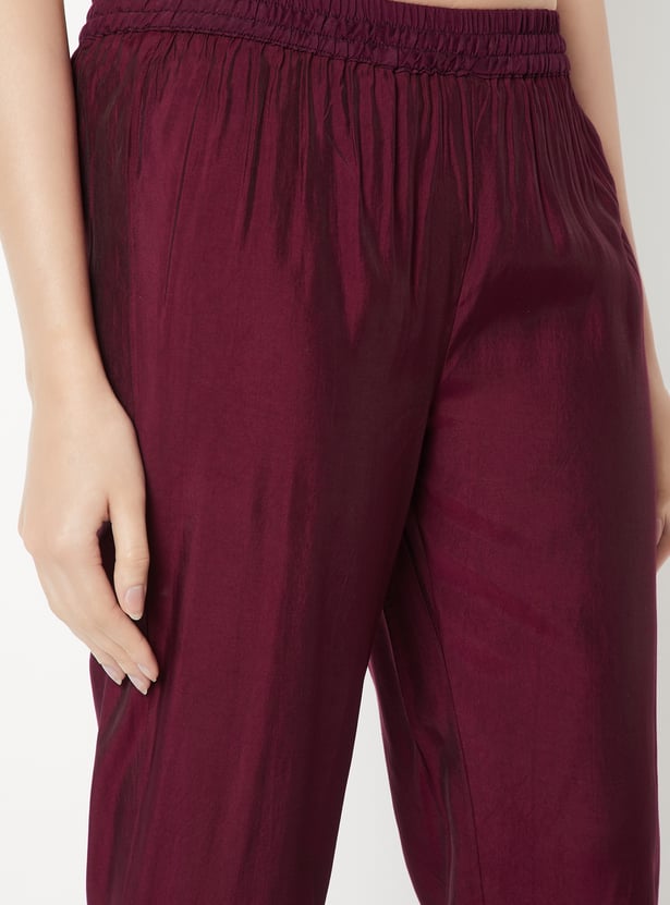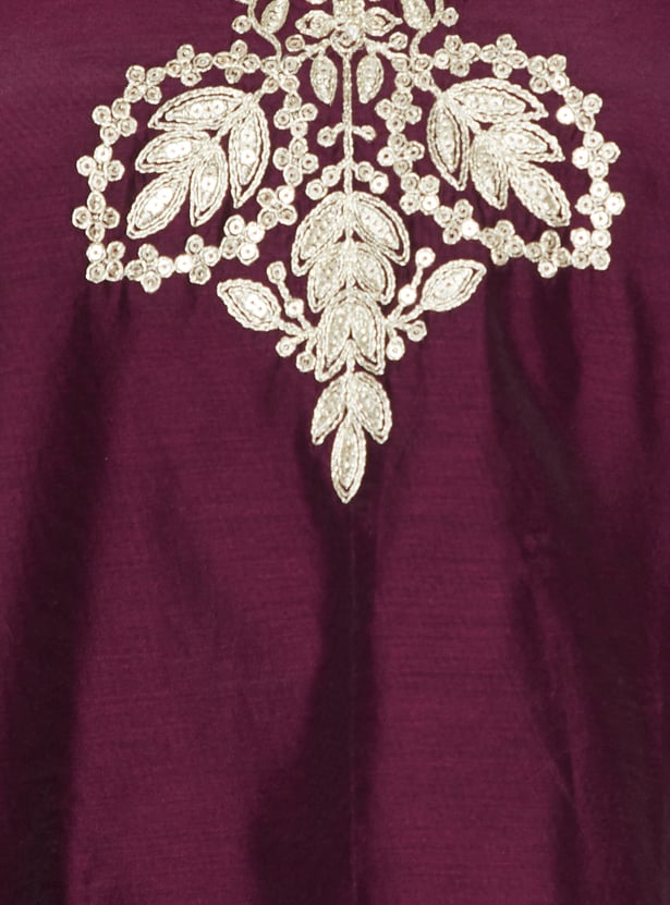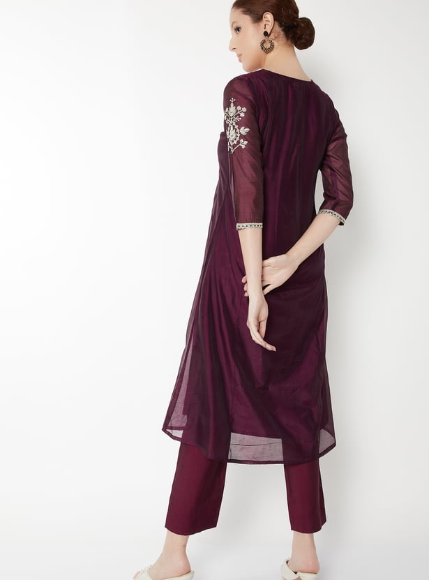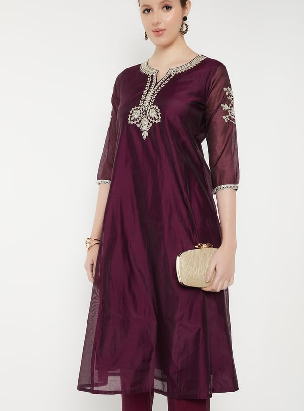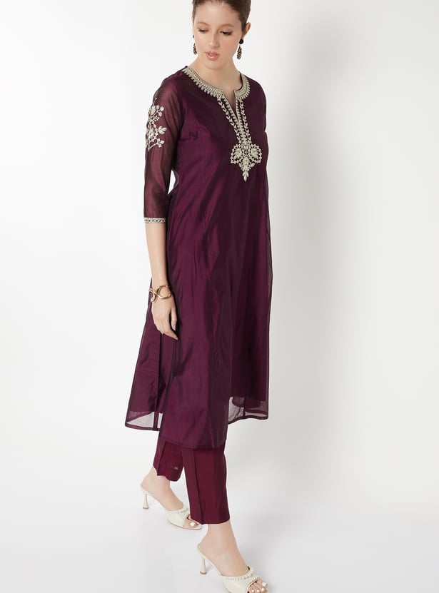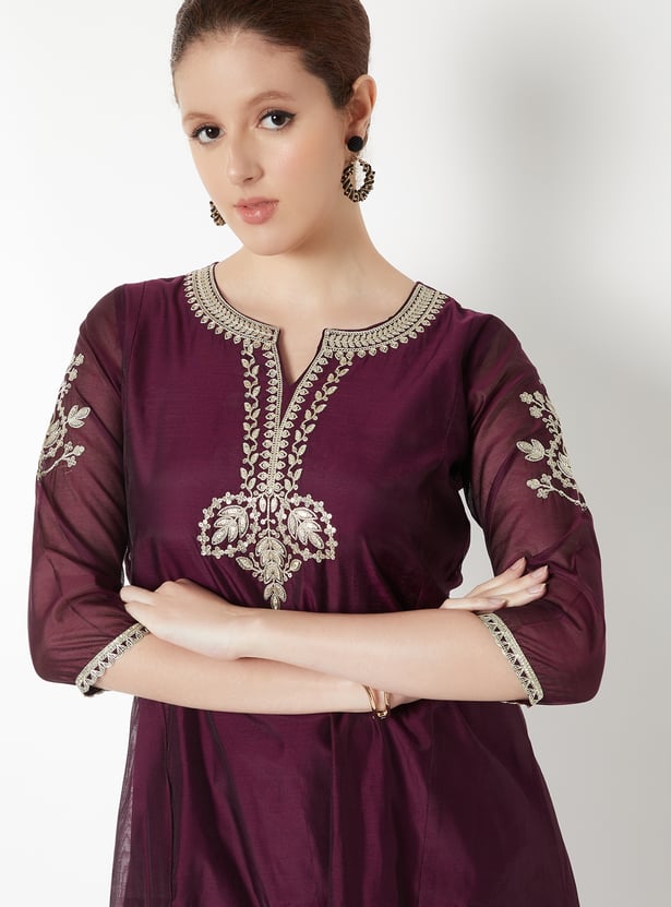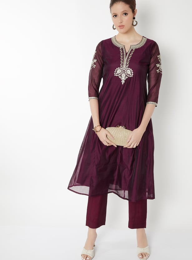 Designed with three-quarter length sleeves, a notched neck, and a knee-length silhouette, this embroidered kurta is complemented by a pair of straight pants and a dupatta. Crafted from soft, breathable fabric, it ensures all-day comfort while offering an effortlessly elegant look.