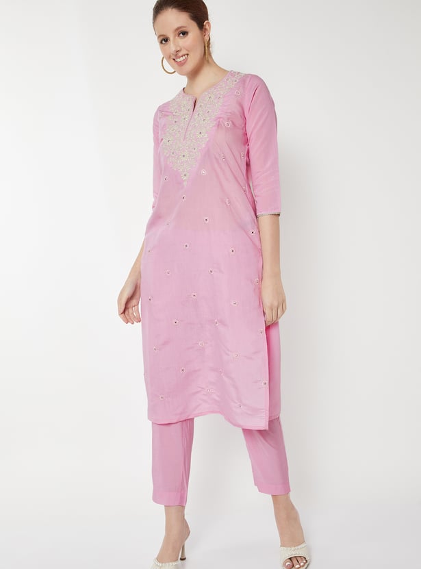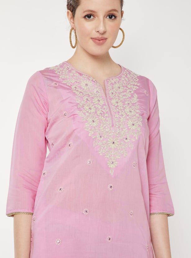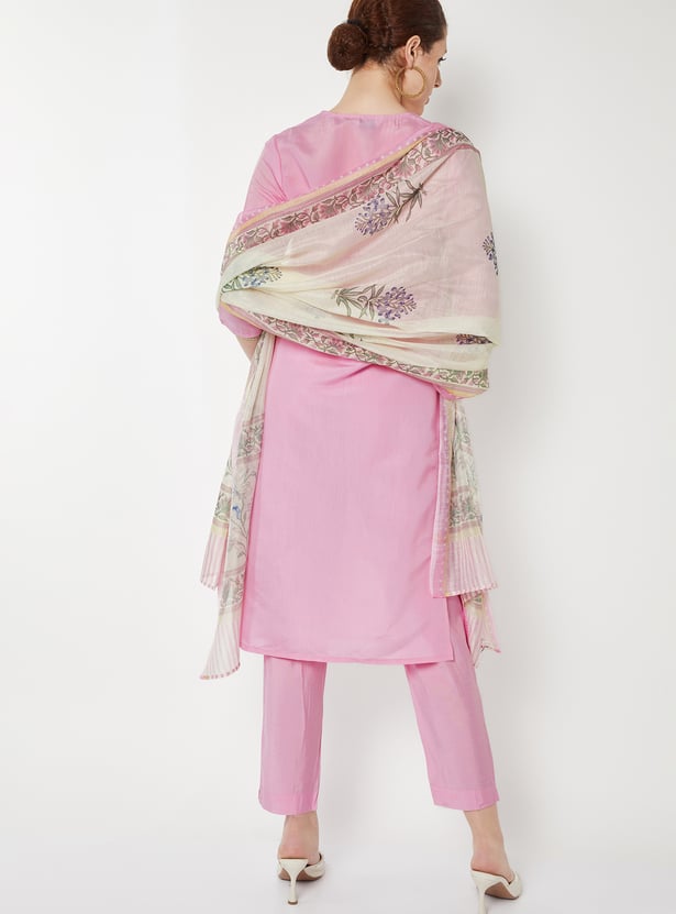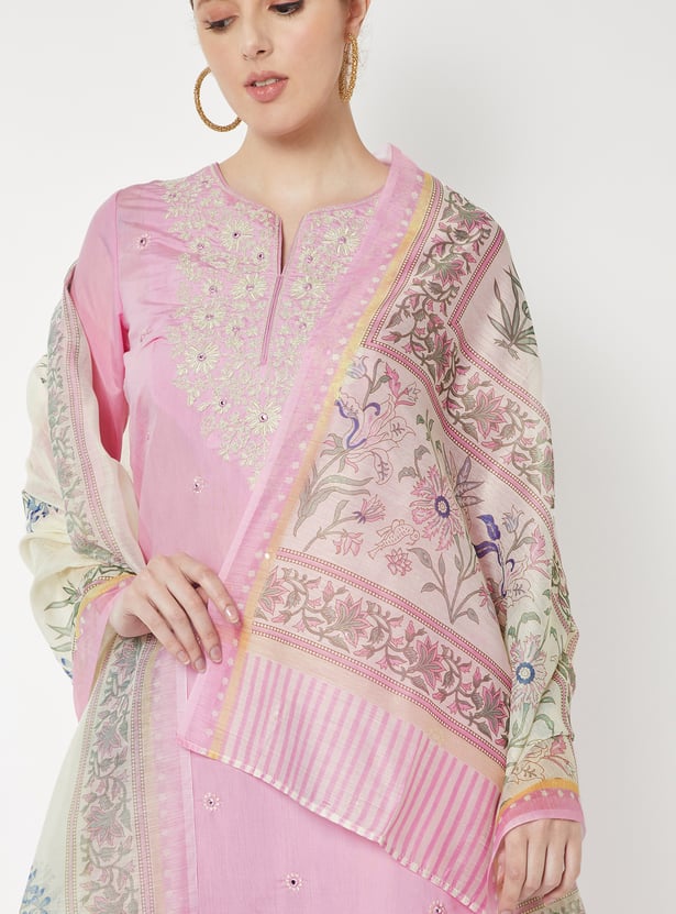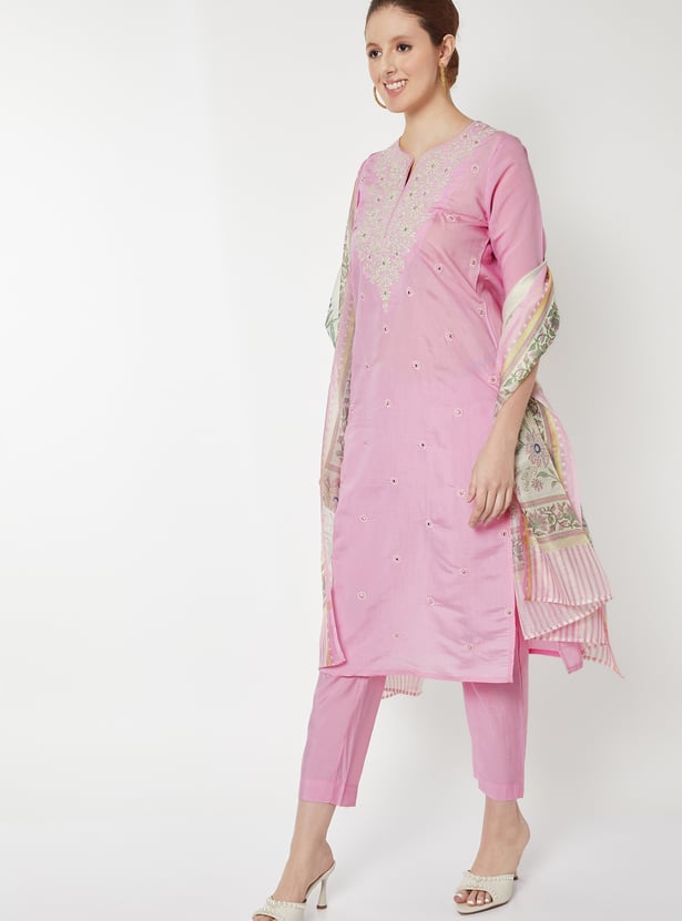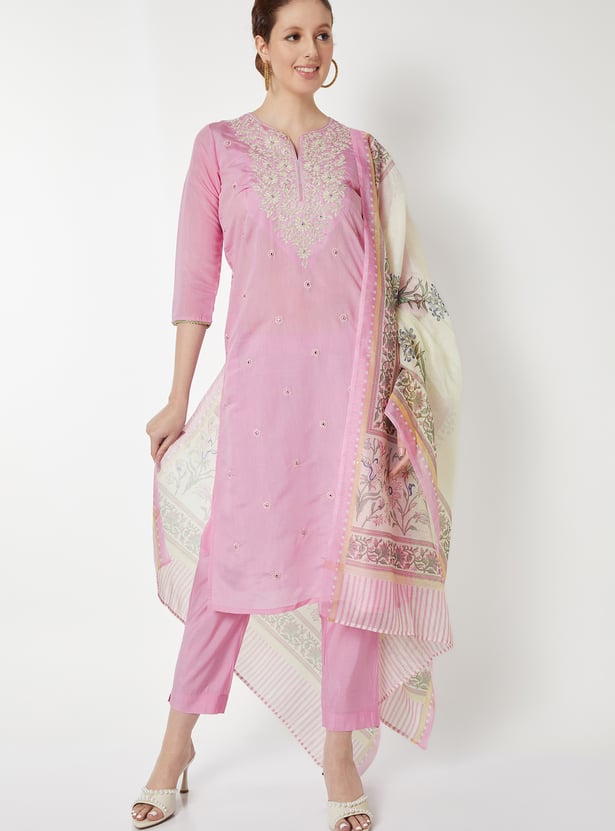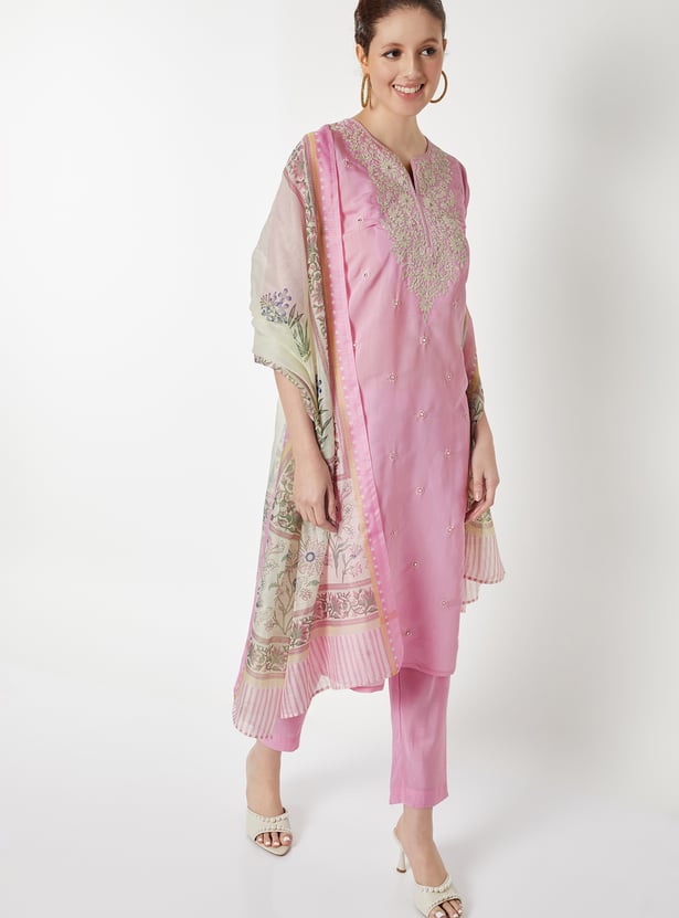 Bring timeless elegance to your wardrobe with this embroidered straight kurta set, crafted for comfort and sophistication. The kurta features a notched neckline, 3/4th sleeves, and side slits for ease of movement. It is paired with straight pants with an elasticated waist and complemented by a dupatta that completes the ensemble with graceful charm.