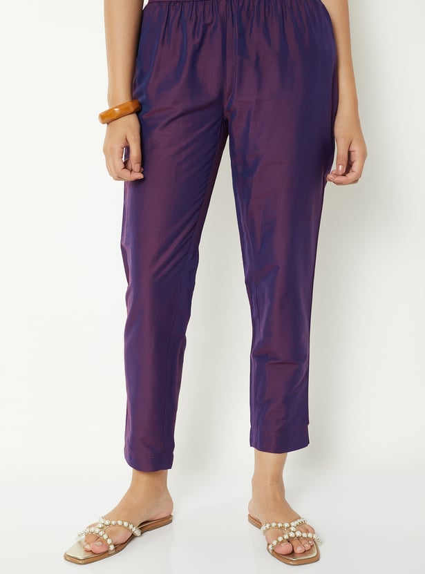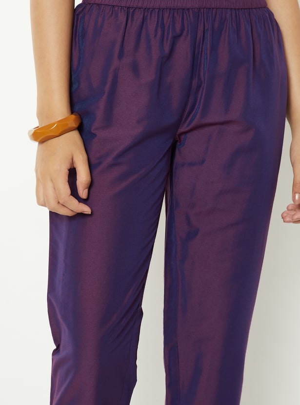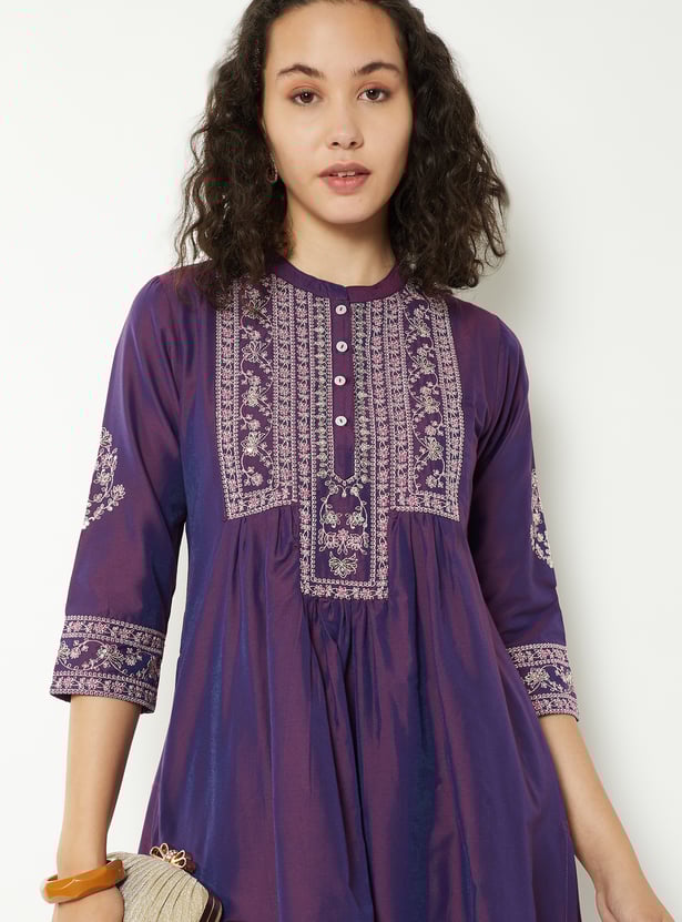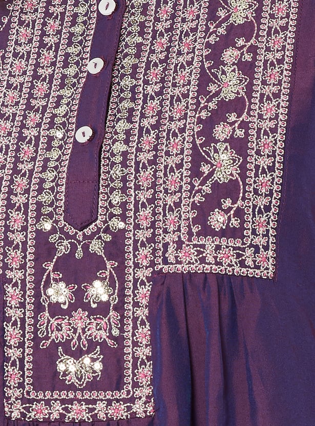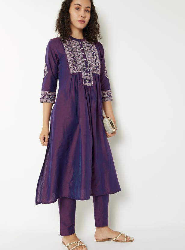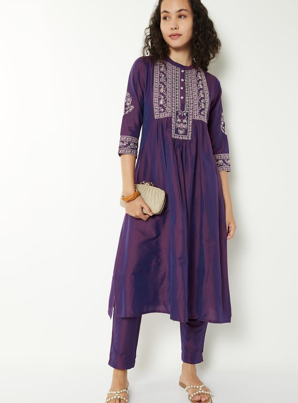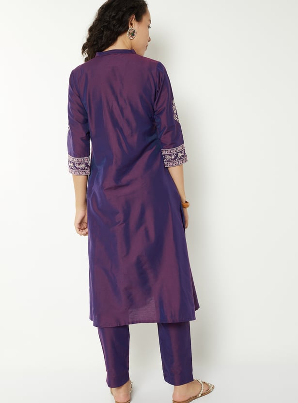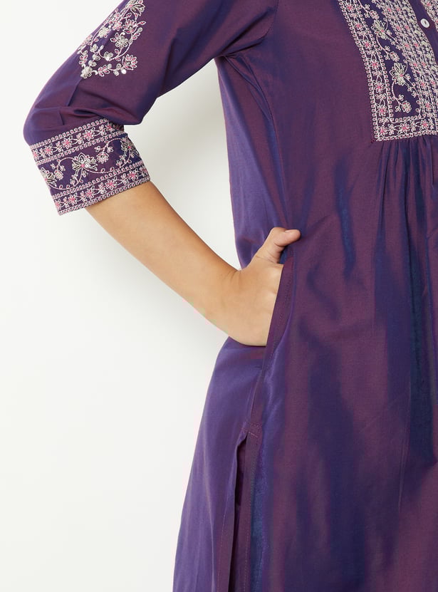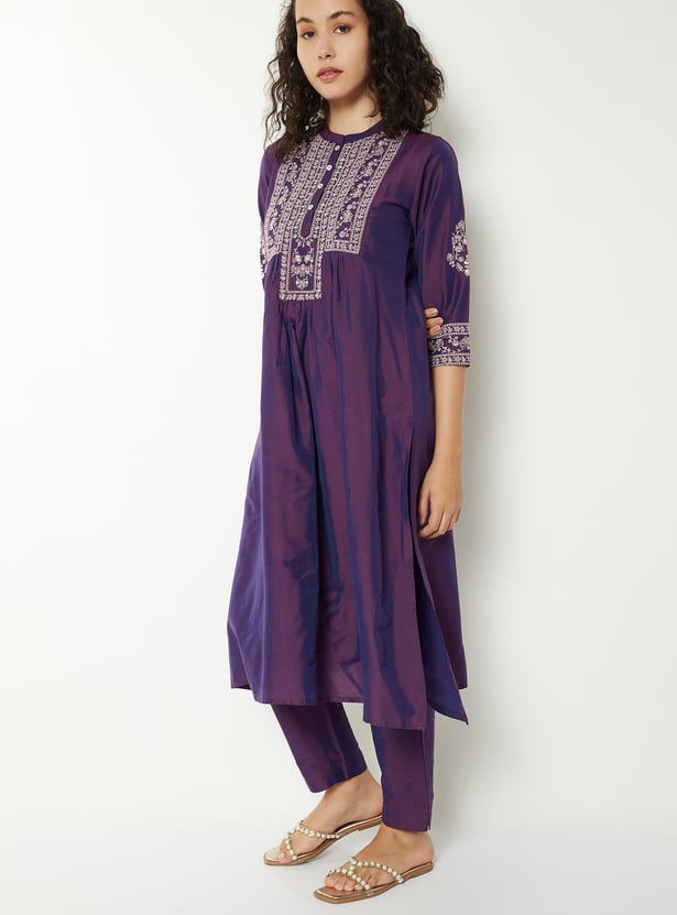 Elevate your ethnic wardrobe with this kurta set designed for effortless elegance. Featuring an embroidered kurta with a band collar, 3/4th sleeves, pockets, side slits, and solid elasticated straight pants.